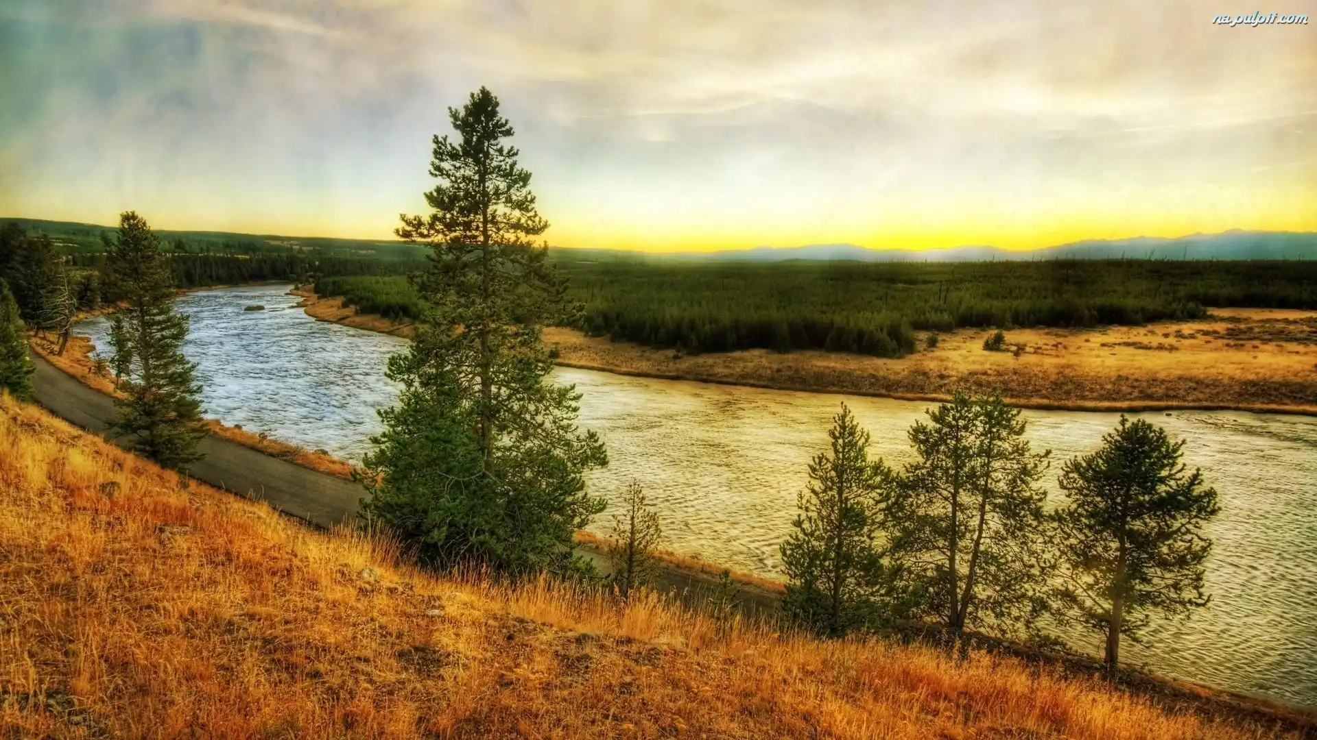 Drzewa, G贸ra, Niebo Drzewa, G贸ry, Jezioro Chmury, Rzeka, Pola, Drzewa Rzeka Kaczuszki, Rzeka, Zach贸d S艂o艅ca choinki, G贸ry, Drzewa Drzewo, Gruby, Pie艅 Drzewa, Jesie艅, G贸ry, Chmurki Morze, Drzewo, Ska艂a G贸rskie, O艣wietlone, Szczyty Drzewo, Jesie艅 Zach贸d S艂o艅ca, Drzewo Drzewo, 艢cia偶ka Droga, Jesie艅, Z艂ota, Prosta