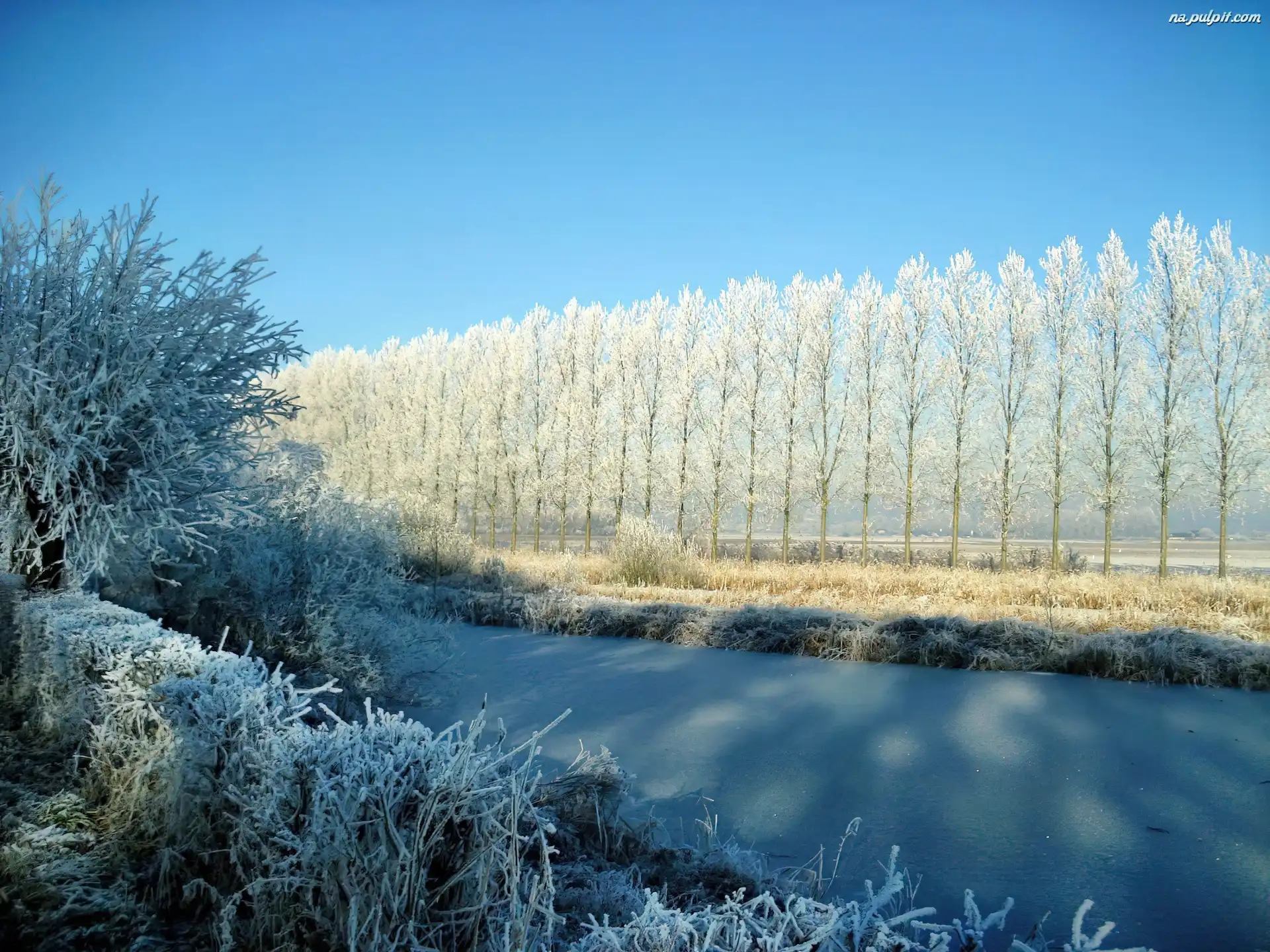 Drzewa, Oszronione, Rzeka, Krzewy Na Pulpit