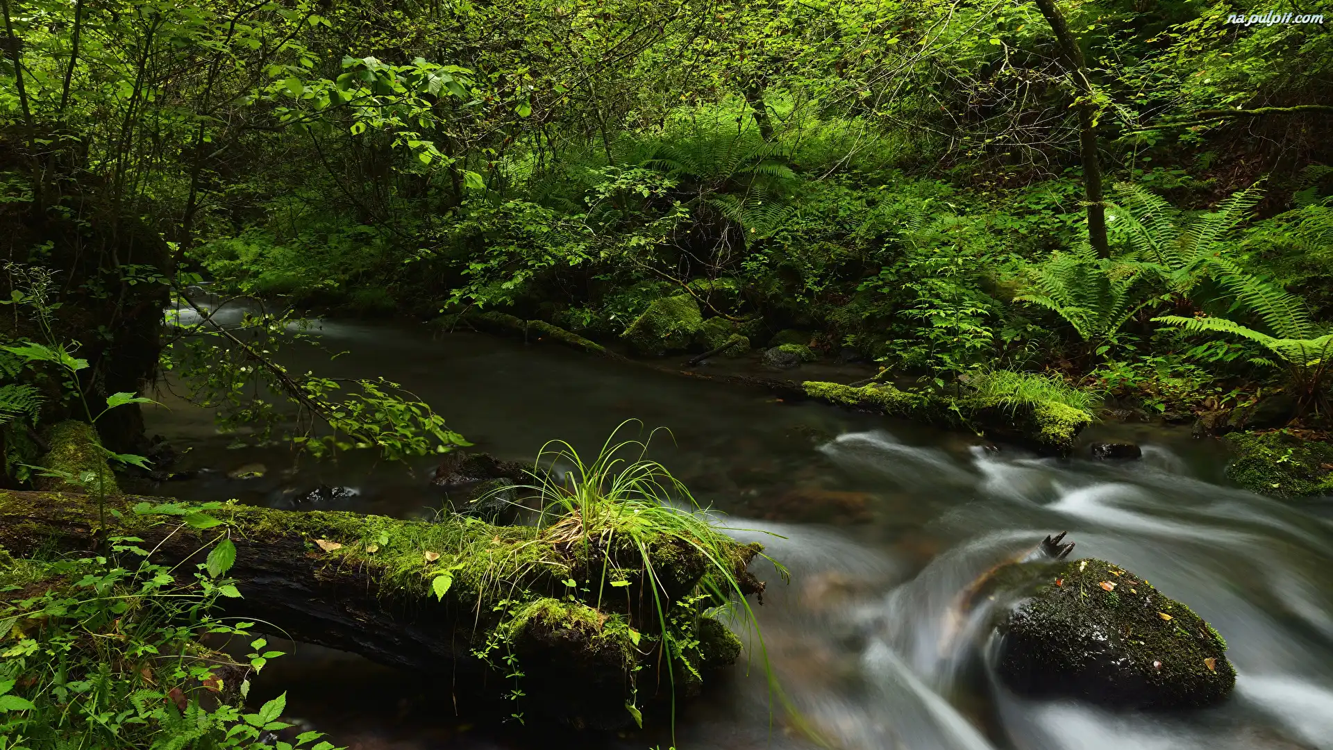 Rzeka, Drzewa, Kamienie, Mech, Krzewy, Las, Trawa Na Pulpit