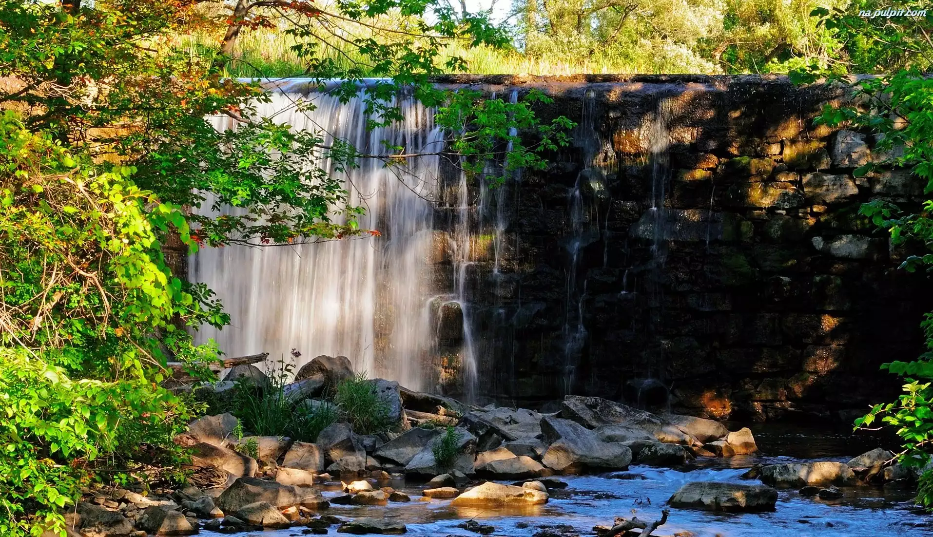 Drzewa, Wodospad, Rzeka, Kamienie Na Pulpit
