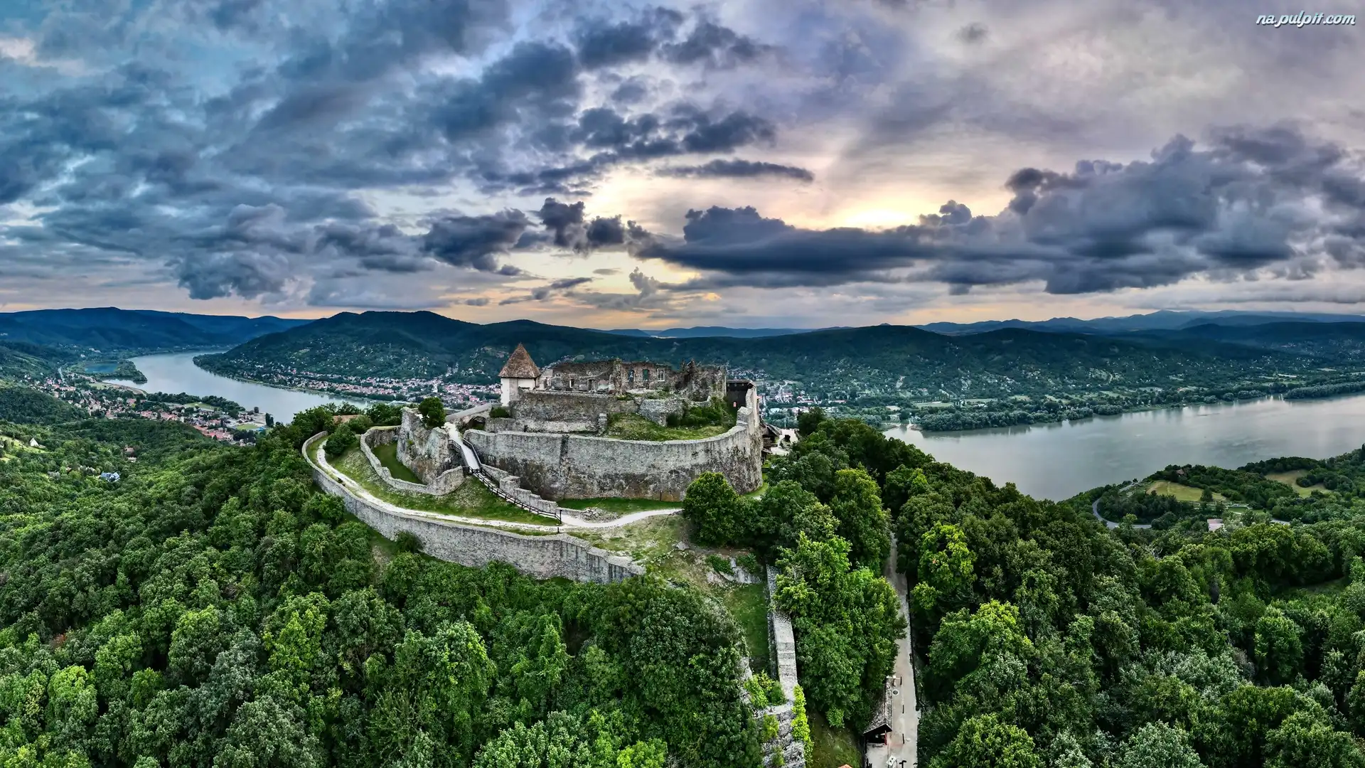 Ruiny, Wyszehrad, Rzeka, Dunaj, Cytadela, Chmury, Wzgórza, Węgry, Drzewa Na Pulpit