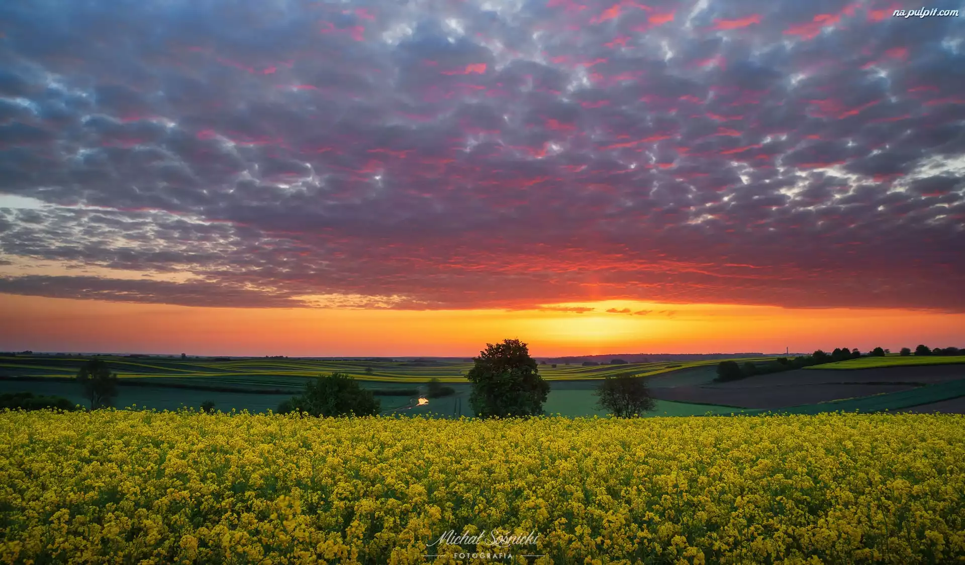 Zachód słońca, Pole, Drzewa, Chmury, Rzepak Na Pulpit