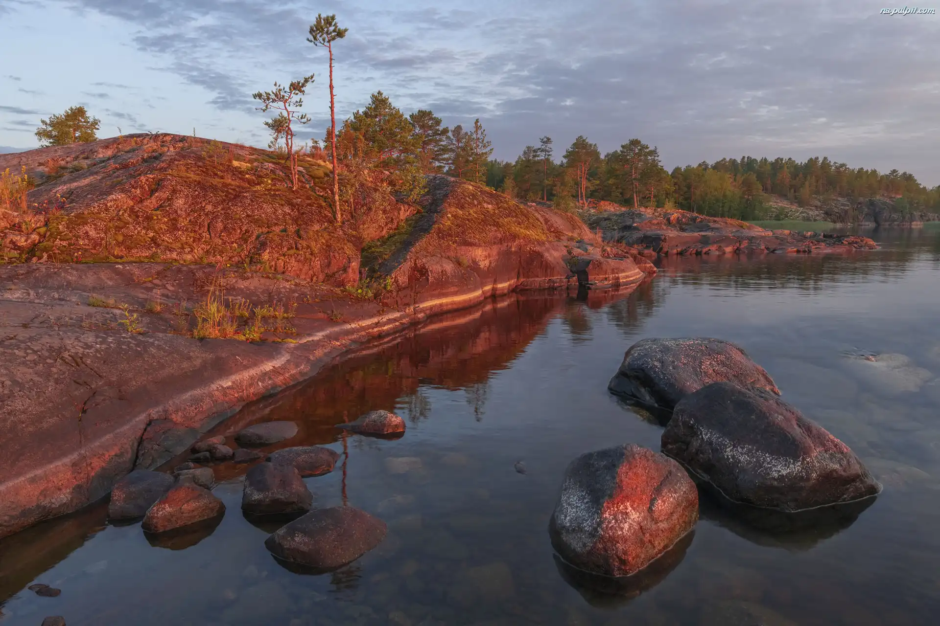 Rosja, Kamienie, Skały, Wschód słońca, Jezioro, Ładoga, Drzewa Na Pulpit