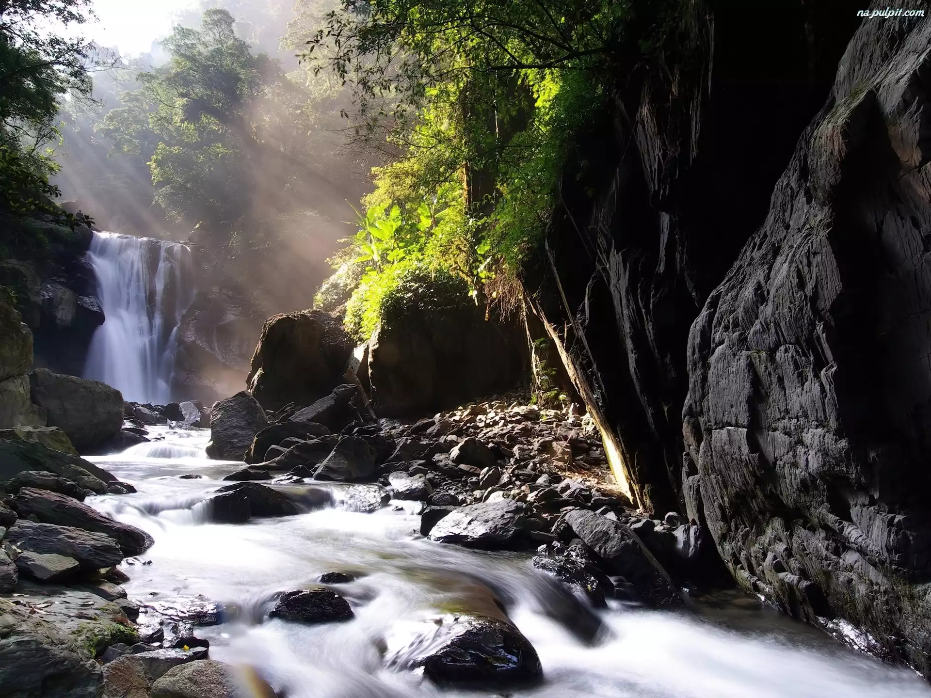 Drzewa, Rzeczka, Skały, Wodospad Na Pulpit