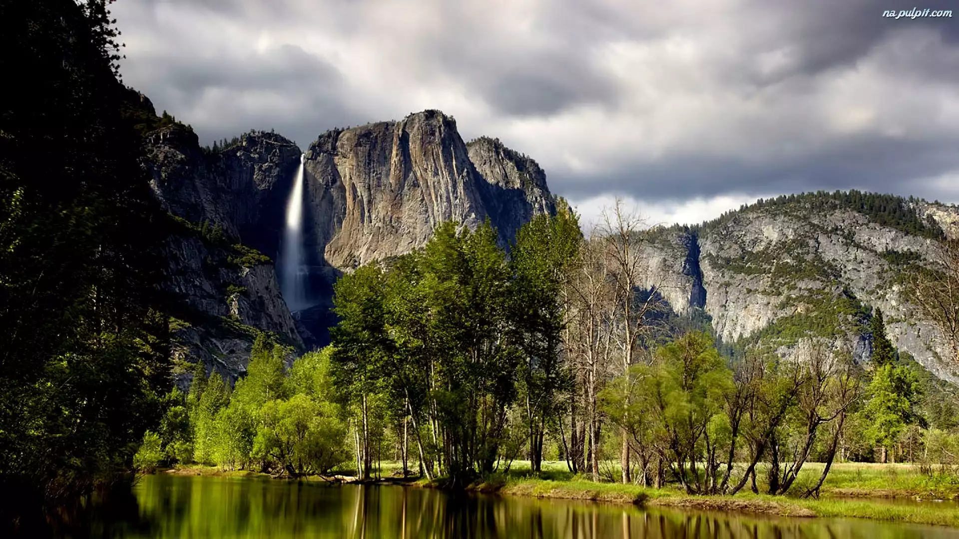 Drzewa, Wodospad, Skały, Jezioro Na Pulpit