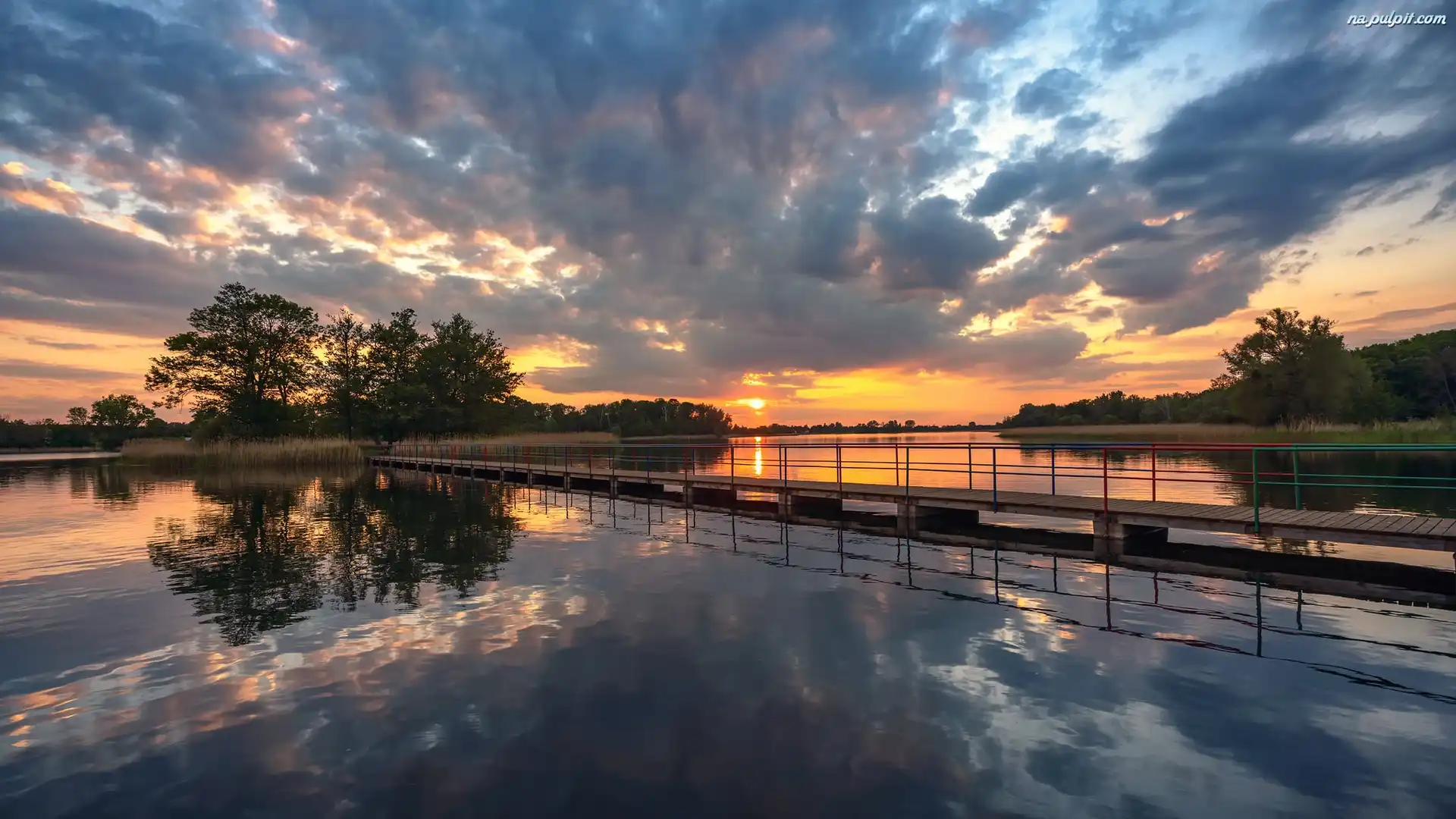 Drzewa, Most, Jezioro, Zachód słońca, Chmury Na Pulpit