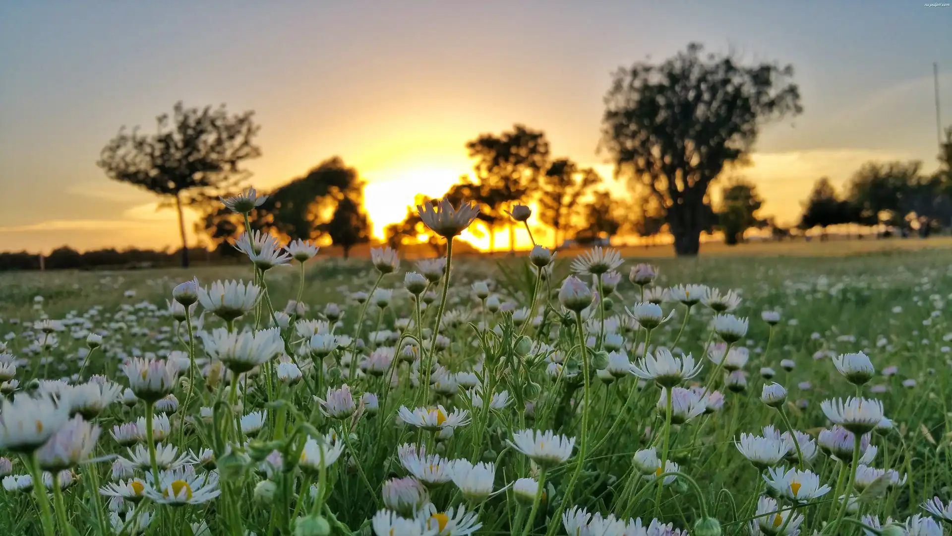 Drzewa, Łąka, Wschód słońca, Stokrotki Na Pulpit