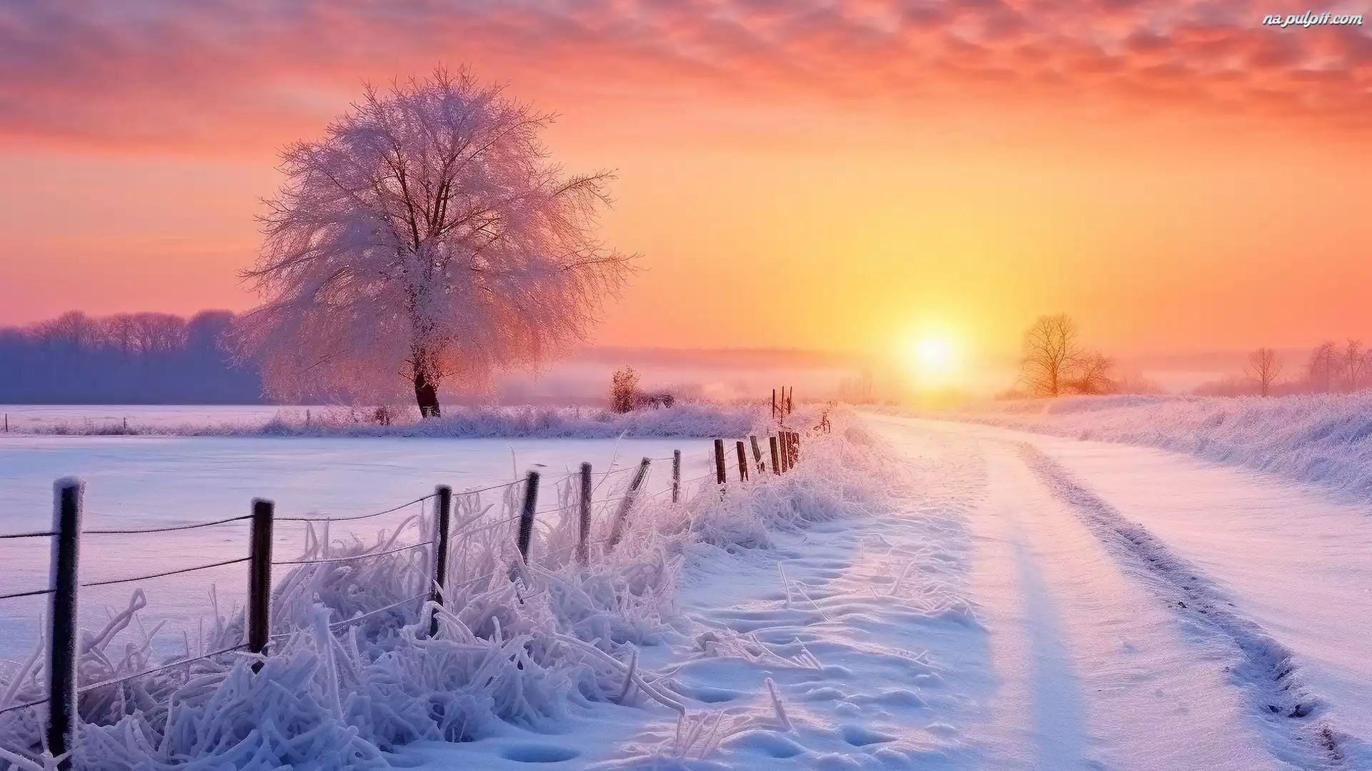 Ośnieżona, Wschód słońca, Drzewa, Droga, Zima, Ogrodzenie Na Pulpit
