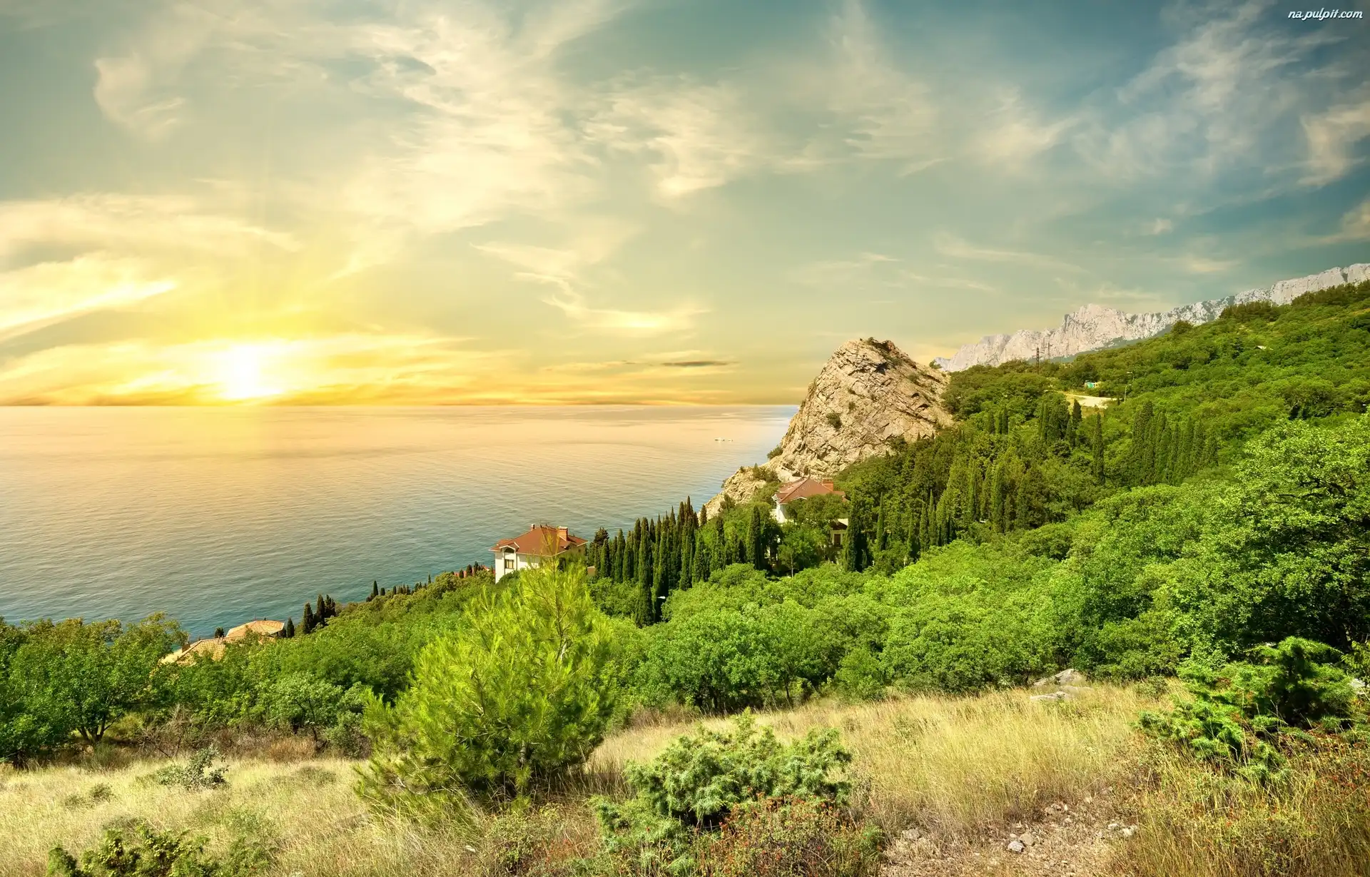 Wybrzeże, Drzewa, Domy, Morze Czarne, Krym, Wschód słońca Na Pulpit