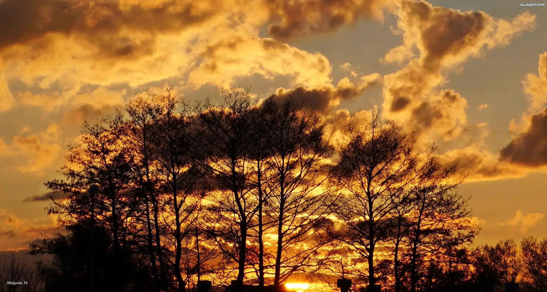 Drzewa, Zachód Słońca, Chmury