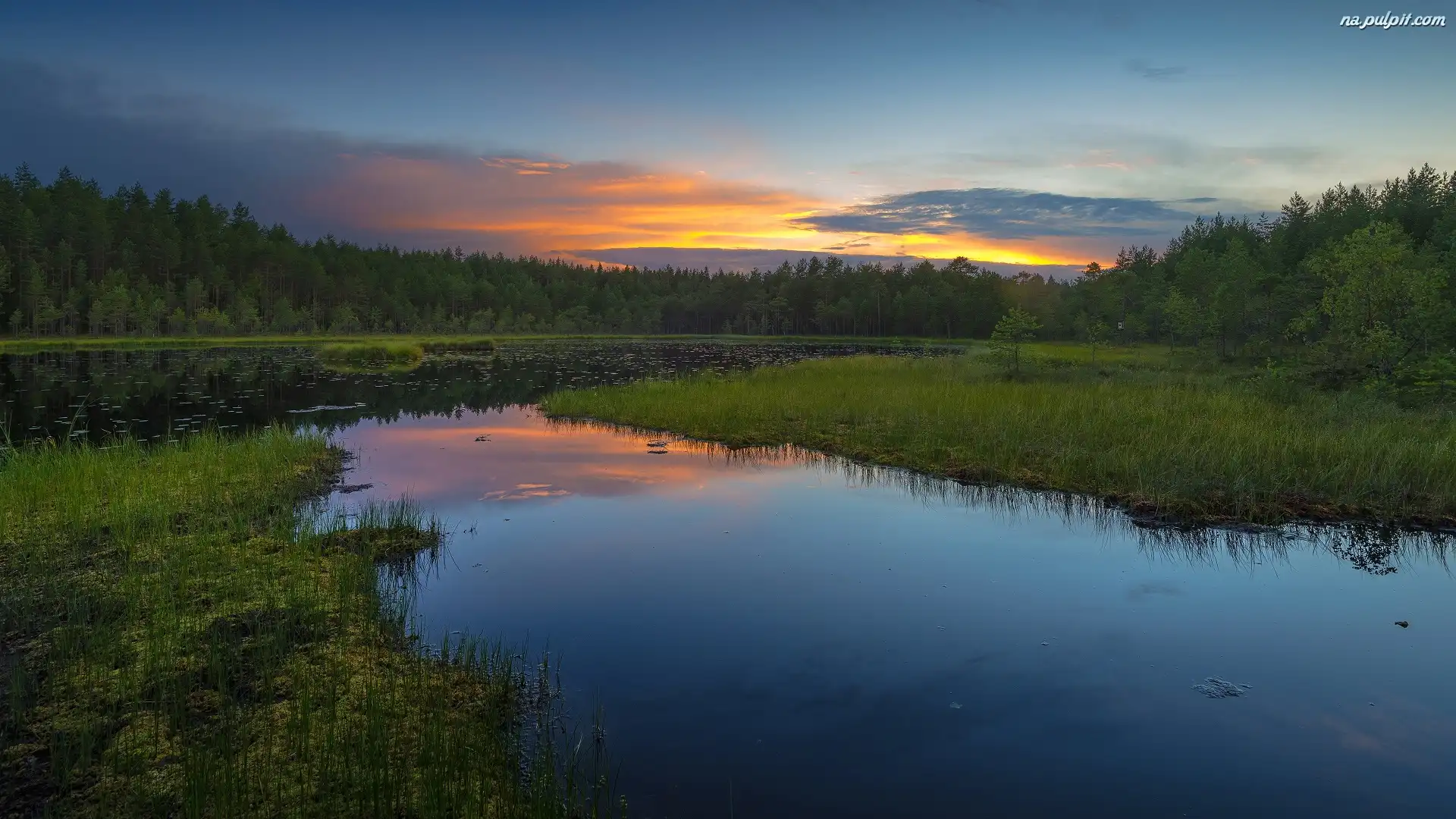 Drzewa, Jezioro, Zachód słońca, Las Na Pulpit