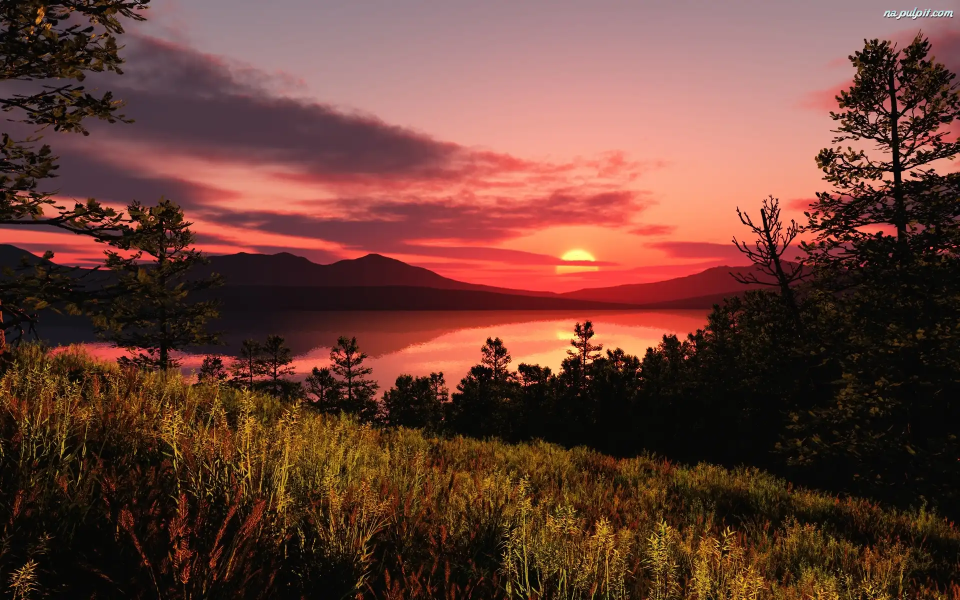 Drzewa, Zachód Słońca, Trawa Na Pulpit