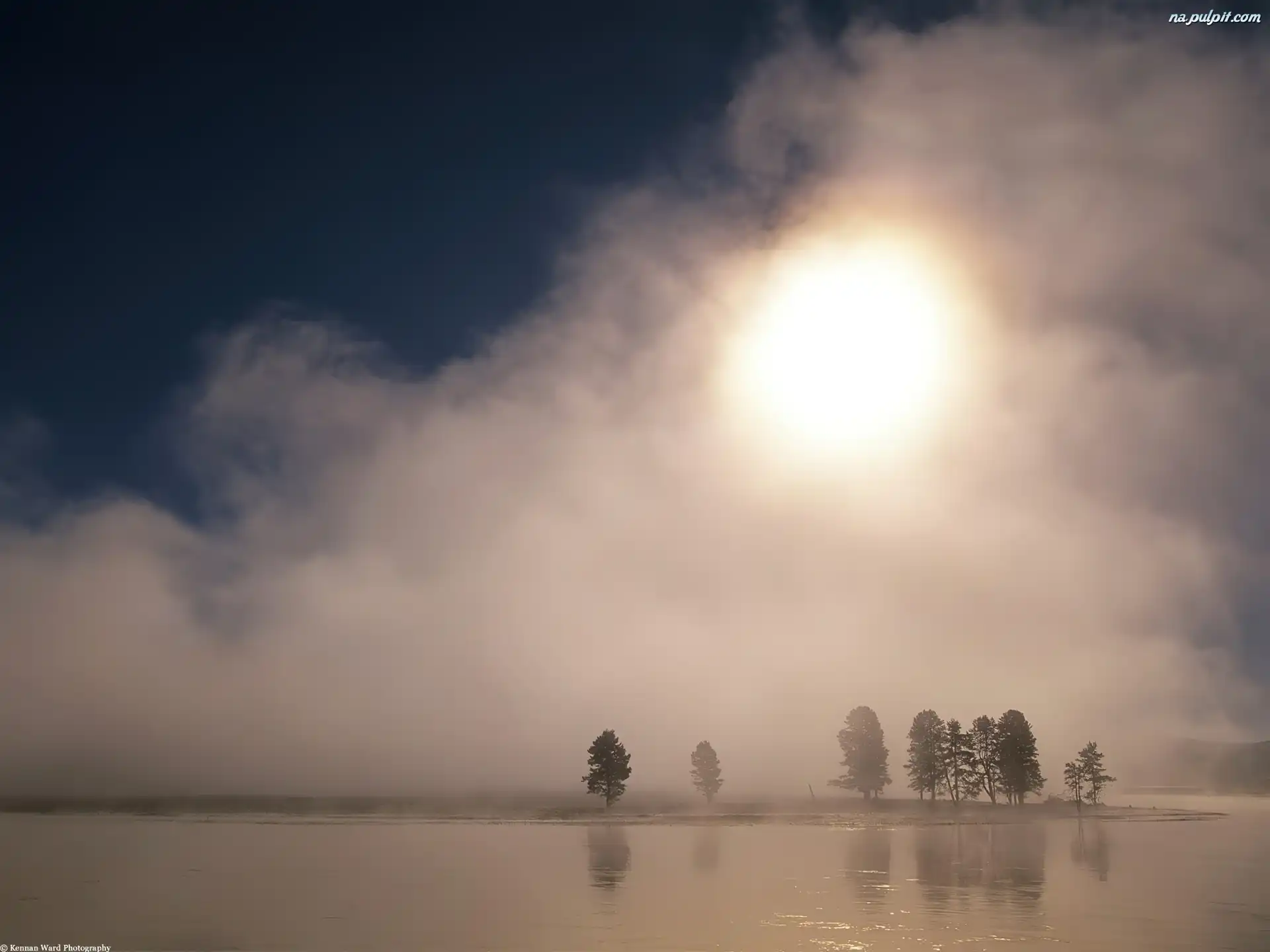 Drzewa, Chmurami, Za, Słońce, Jezioro