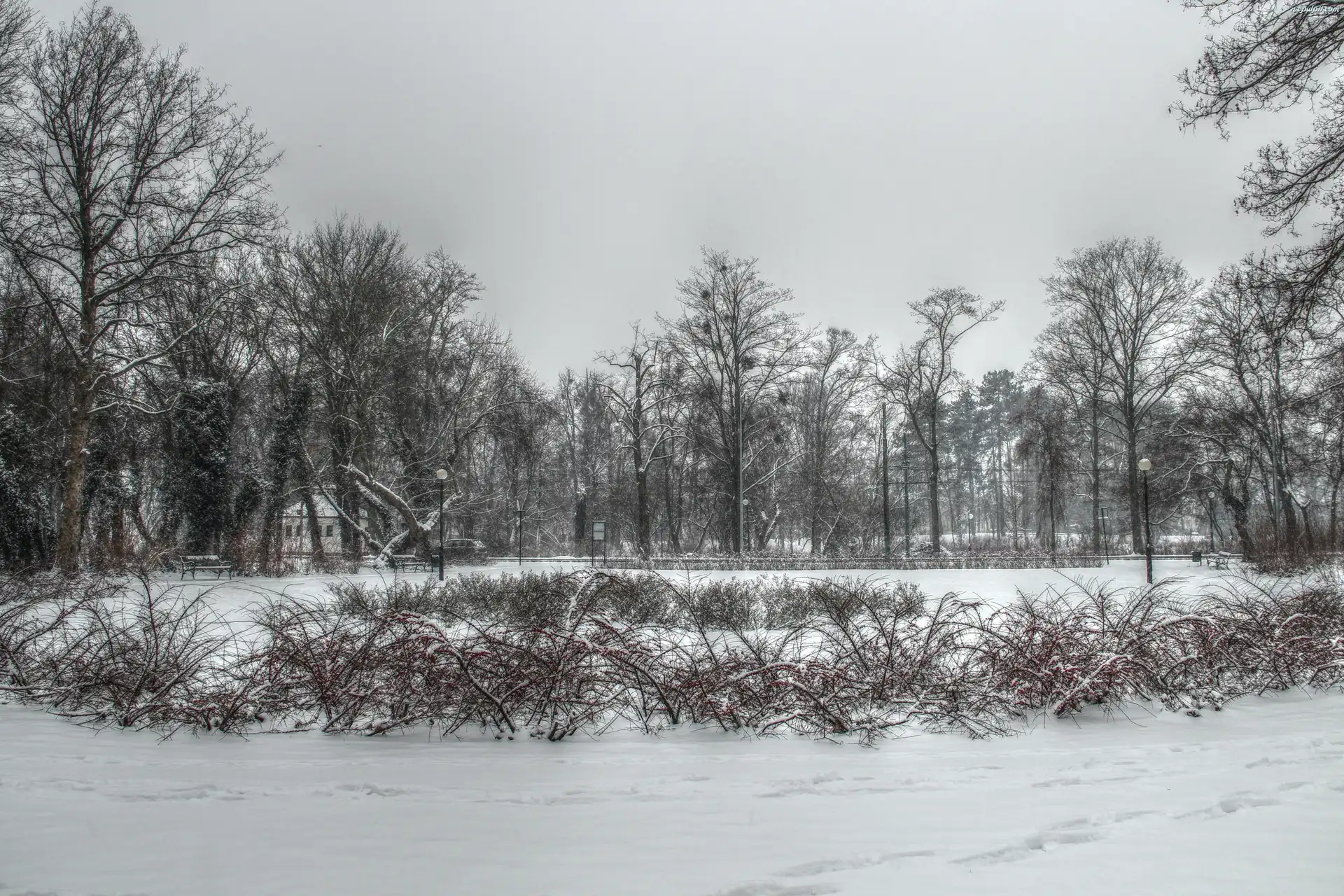 HDR, Drzewa, Poznań, Park, Krzewy, Zima, Plac Spiski