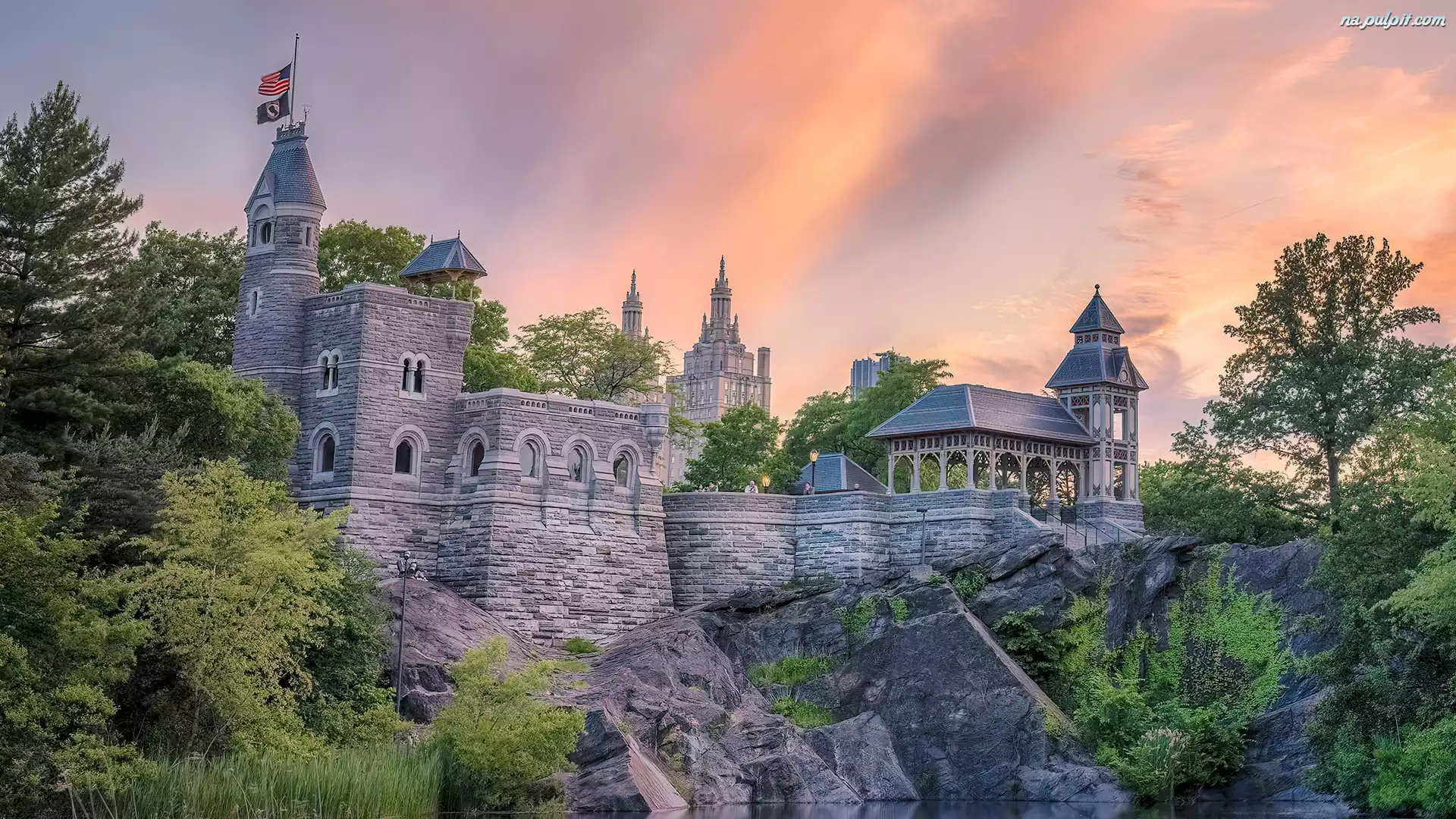 Drzewa, Nowy Jork, Central Park, Zamek Belvedere, Manhattan, Stany Zjednoczone Na Pulpit