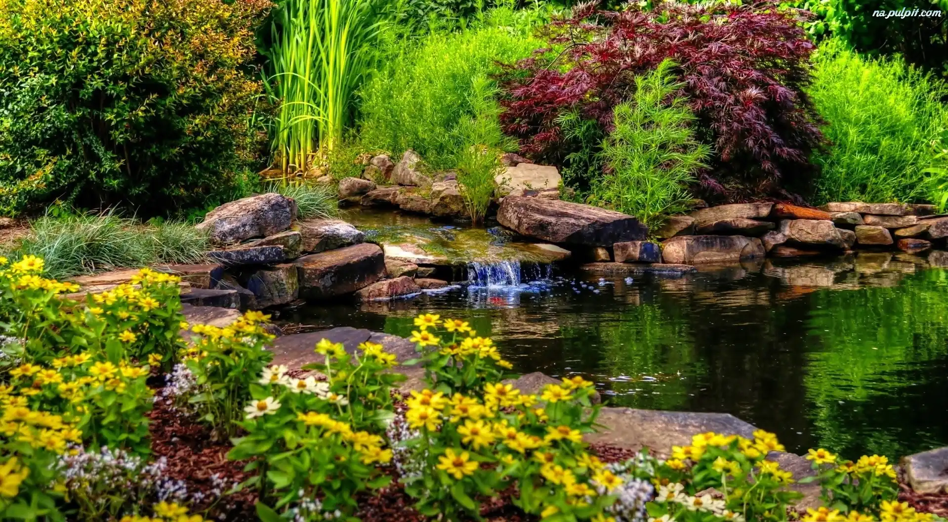 Krzewy, Wodny, Strumyk, Kamienie, Park, Wiosna, Kwiaty, Zbiornik, Drzewa Na Pulpit