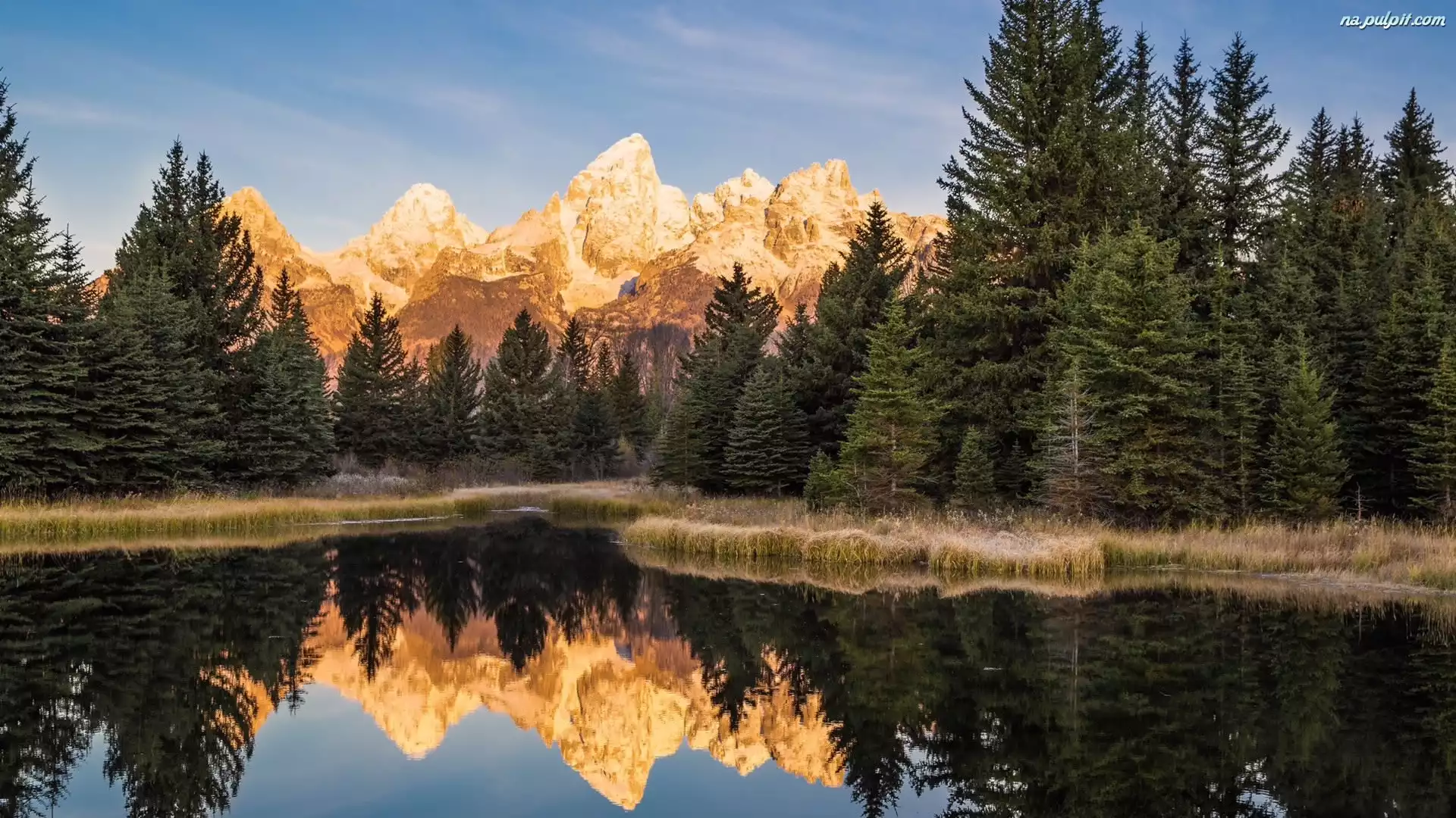 Drzewa, Stan Wyoming, Odbicie, Rzeka Snake River, Park Narodowy Grand Teton, Stany Zjednoczone, Góry Teton Range Na Pulpit |