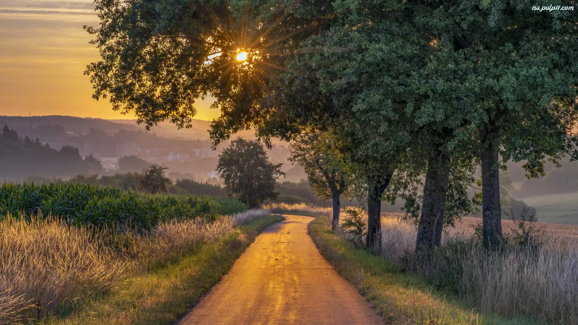 Droga, Góry, Trawa, Drzewa, Łąki, Zachód słońca Na Pulpit