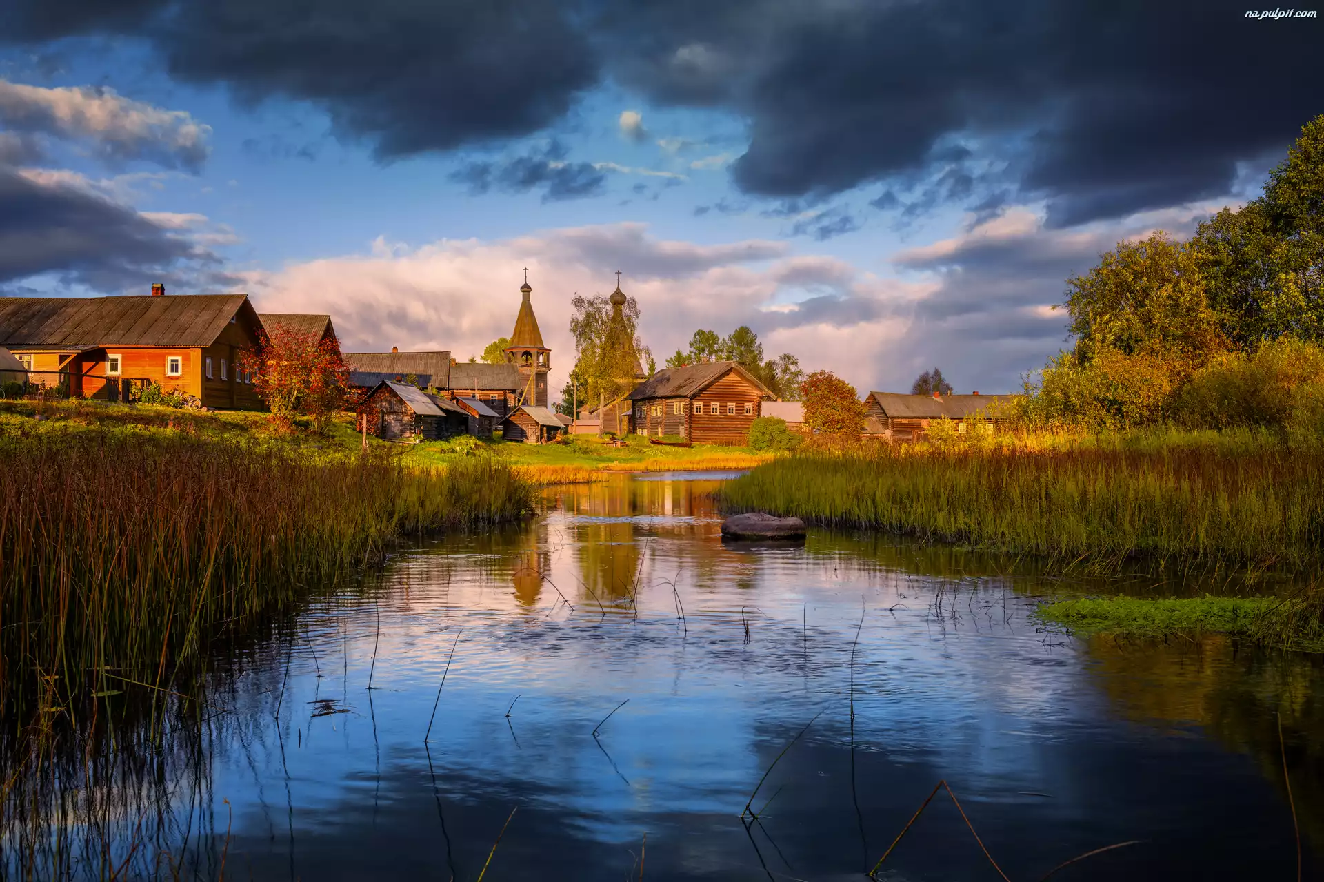 Obwód archangielski, Trzciny, Rosja, Jezioro, Wieś, Domy, Wschód słońca, Drzewa, Cerkiew, Chmury Na Pulpit |