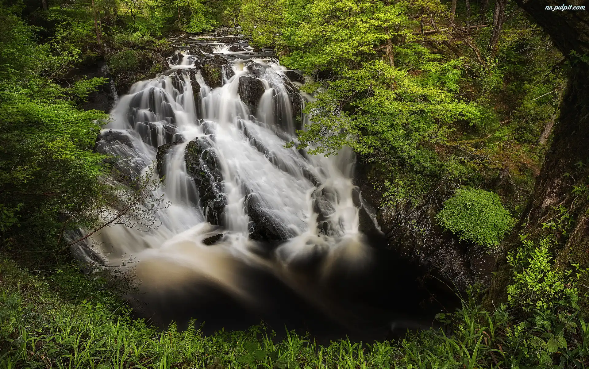Wielka Brytania, Las, Walia, Skały, Drzewa, Wodospad Swallow Falls, Park Narodowy Snowdonia Na Pulpit |