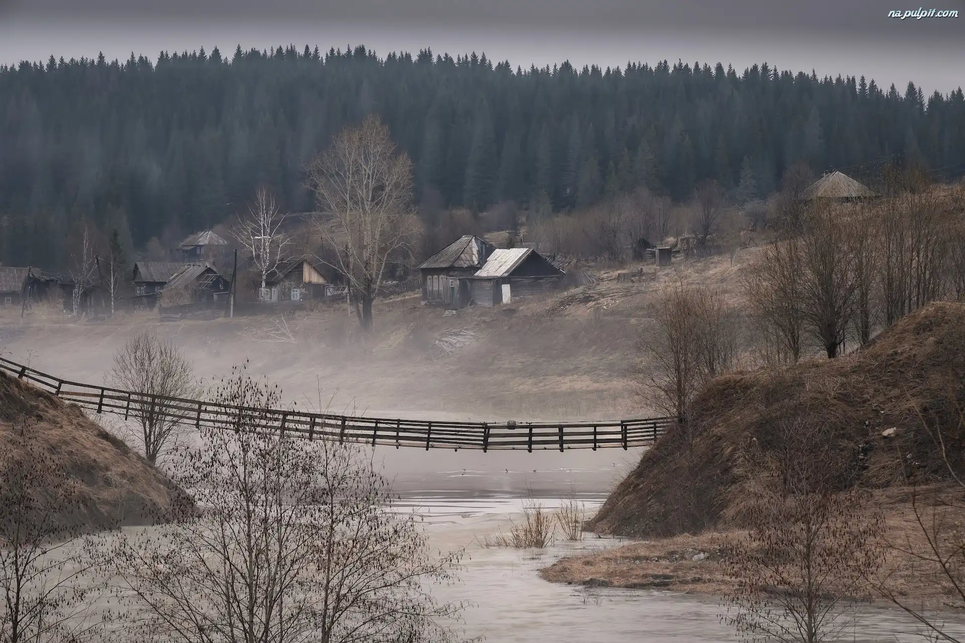 Wieś, Drzewa, Most, Domy, Łąka, Rzeka, Mgła Na Pulpit