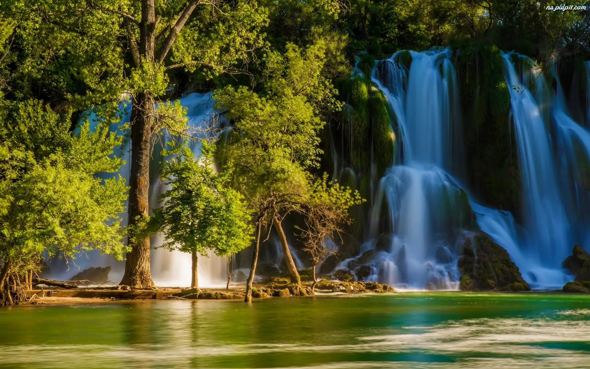 Drzewa, Las, Wodospad, Rzeka