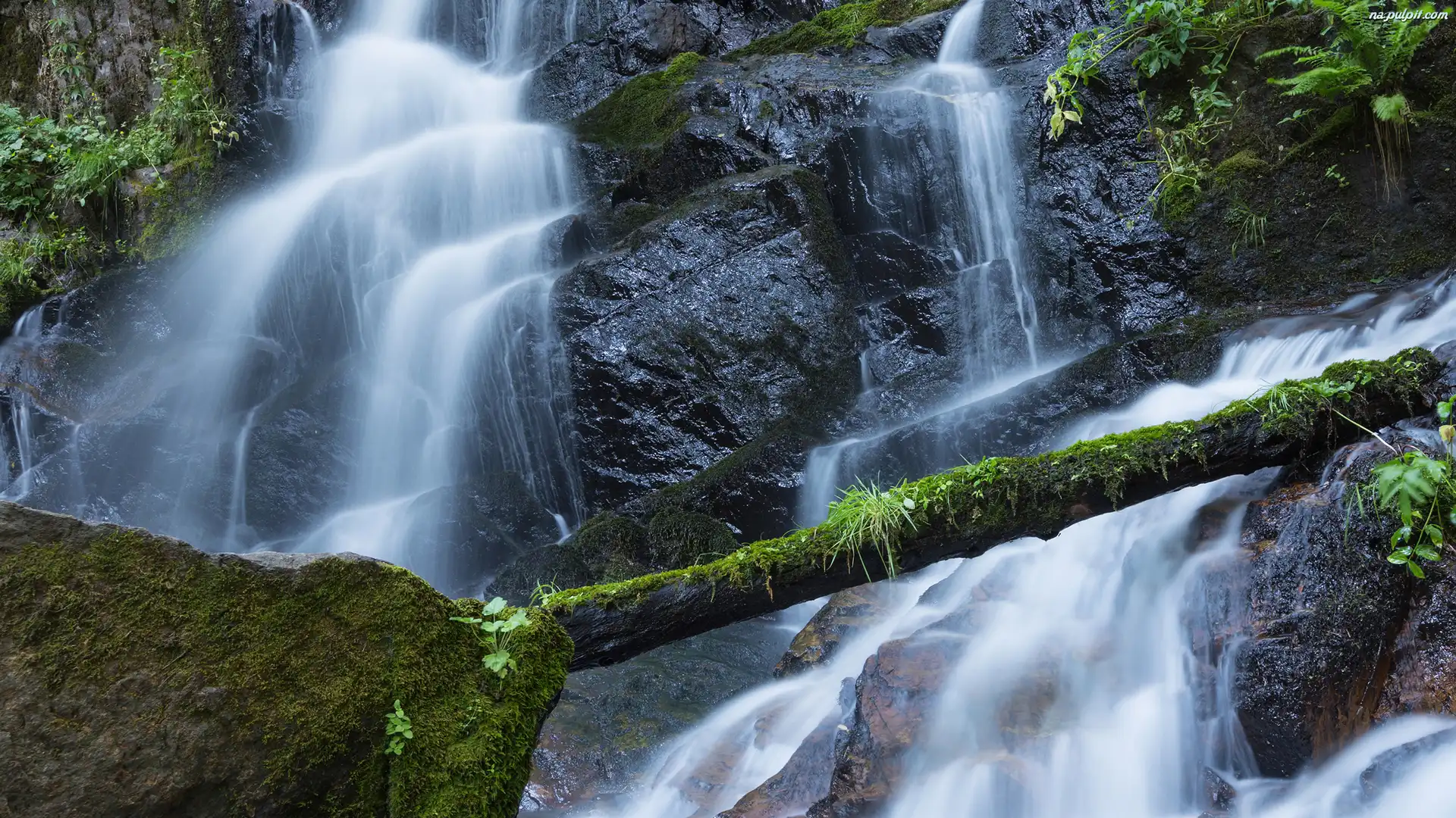 Drzewa, Skały, Omszałe, Wodospad, Pień