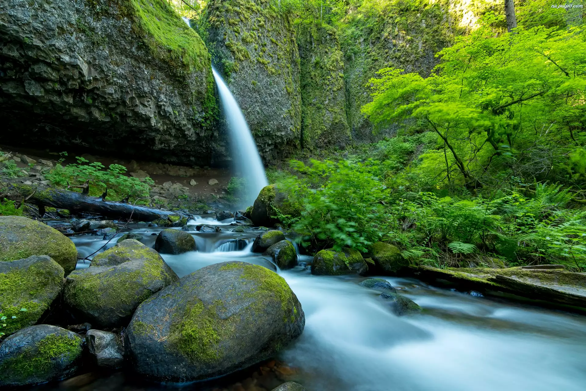 Drzewa, Omszałe, Rzeka, Wodospad, Kamienie Na Pulpit