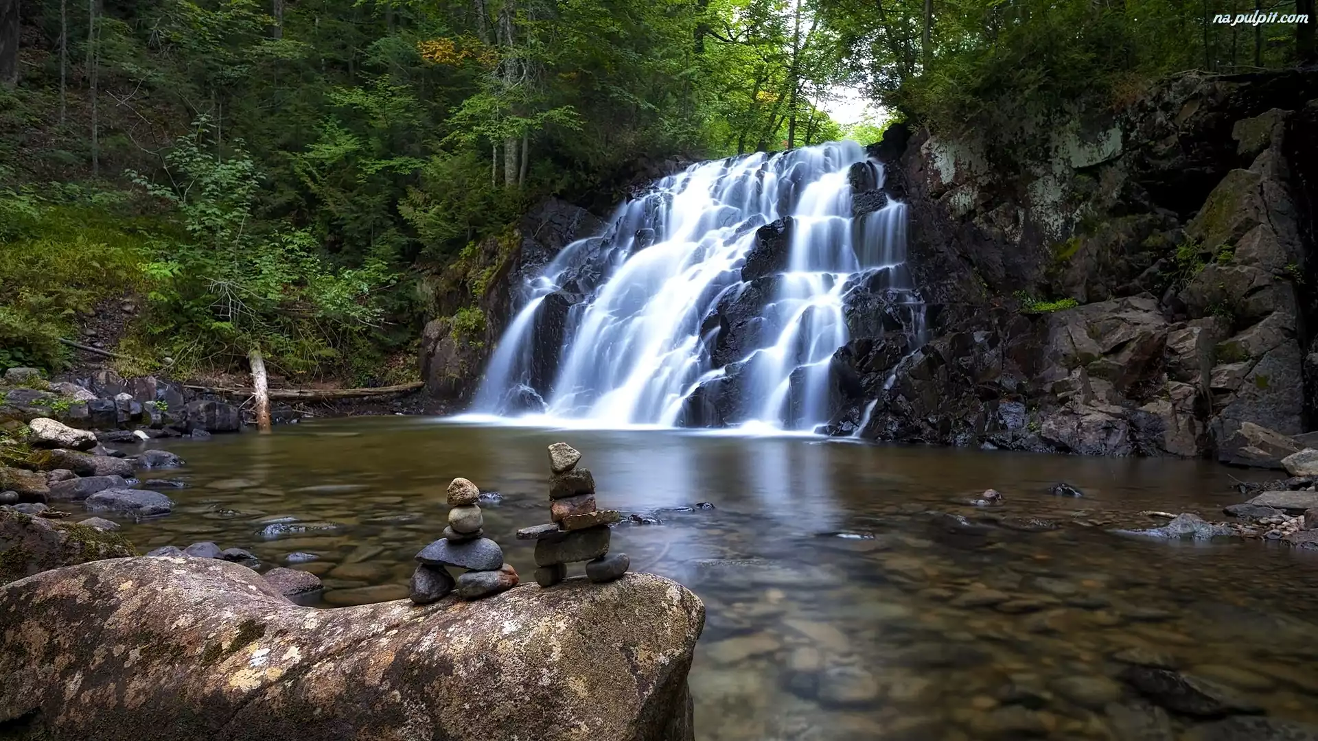 Drzewa, Skały, Wodospad, Rzeka Na Pulpit