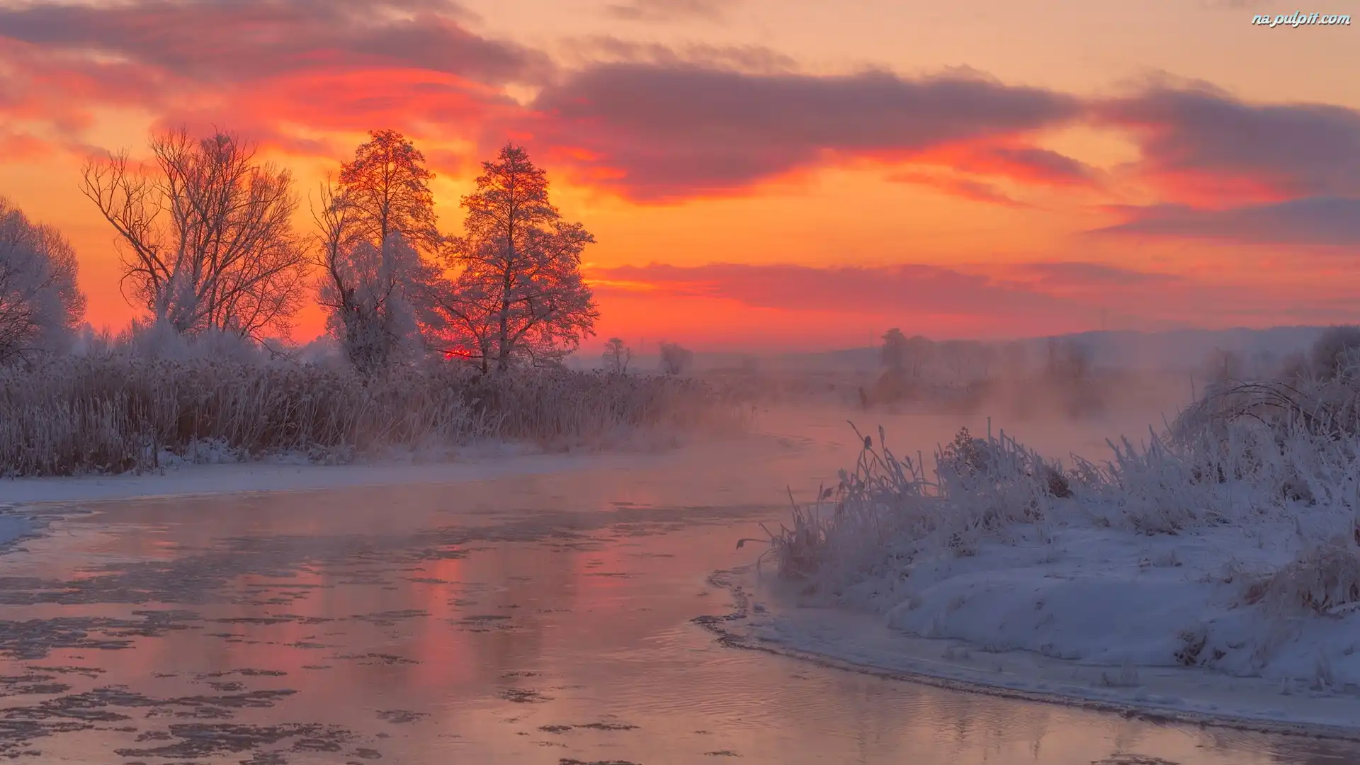 Krzaki, Rzeka Gwda, Mgła, Wschód słońca, Polska, Śnieg, Zima, Drzewa Na Pulpit
