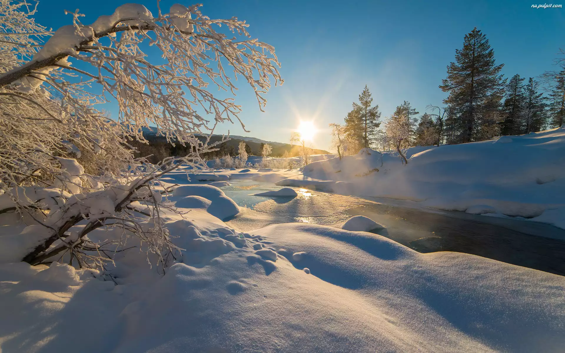 Drzewa, Rzeka, Zima, Wschód słońca Na Pulpit