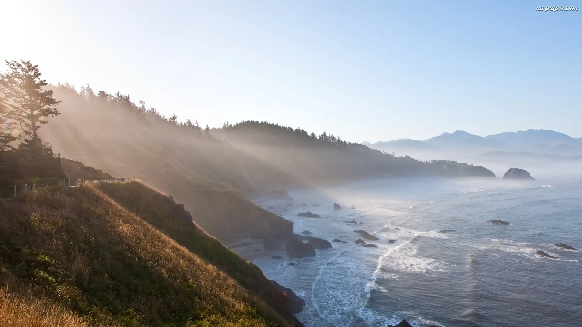 Drzewa, Promienie, Morze, Wybrzeże, Słońca Na Pulpit