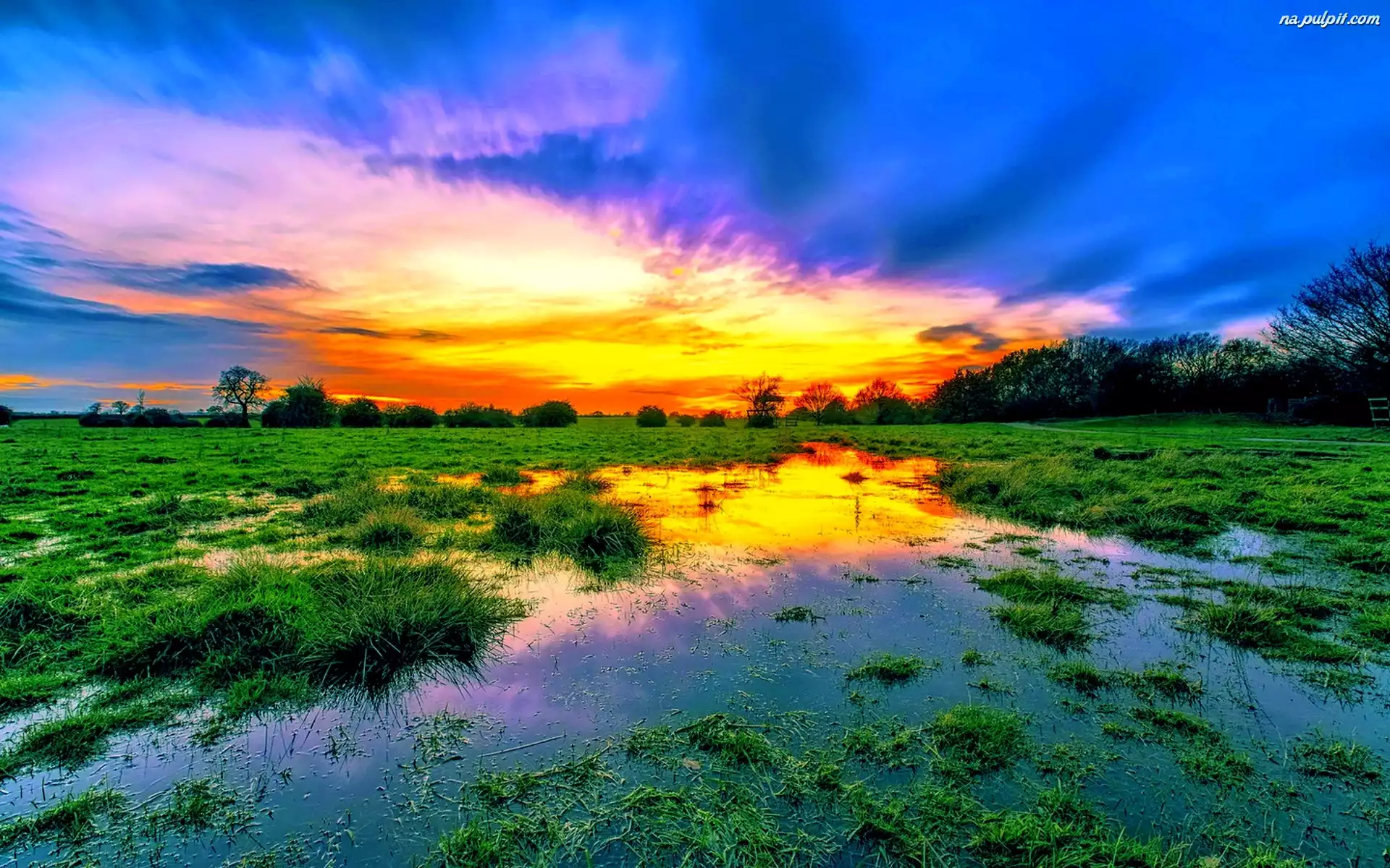 Drzewa, Chmury, Bagno, Łąka, Zachód Słońca