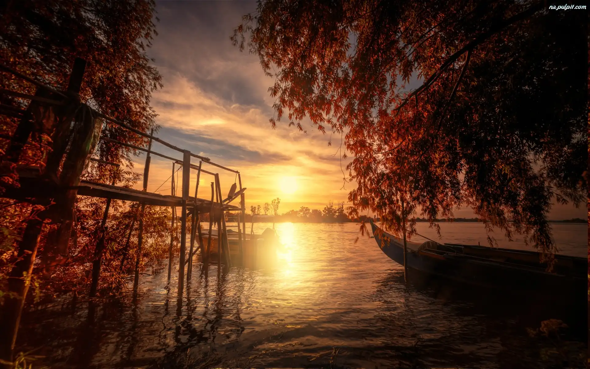 Drzewa, Łodzie, Jezioro, Zachód słońca Na Pulpit