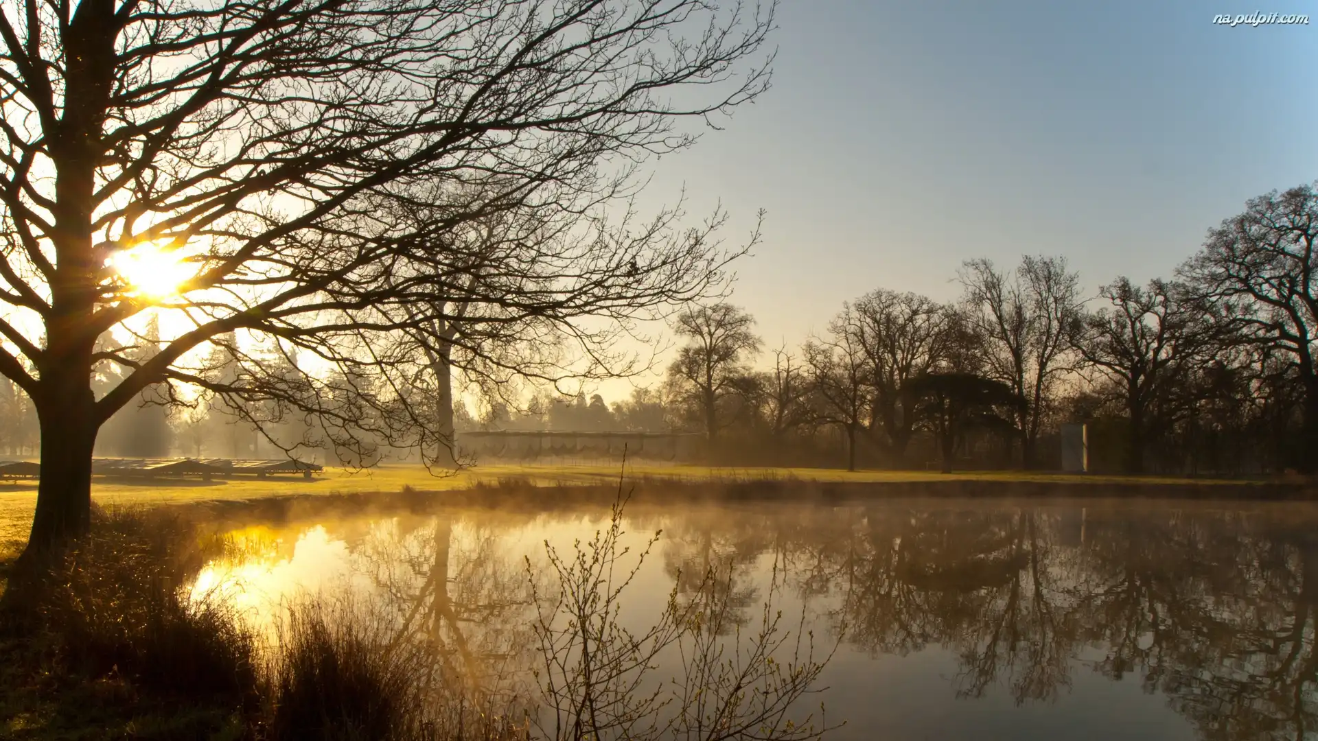 Drzewa, Jezioro, Zachód Słońca Na Pulpit
