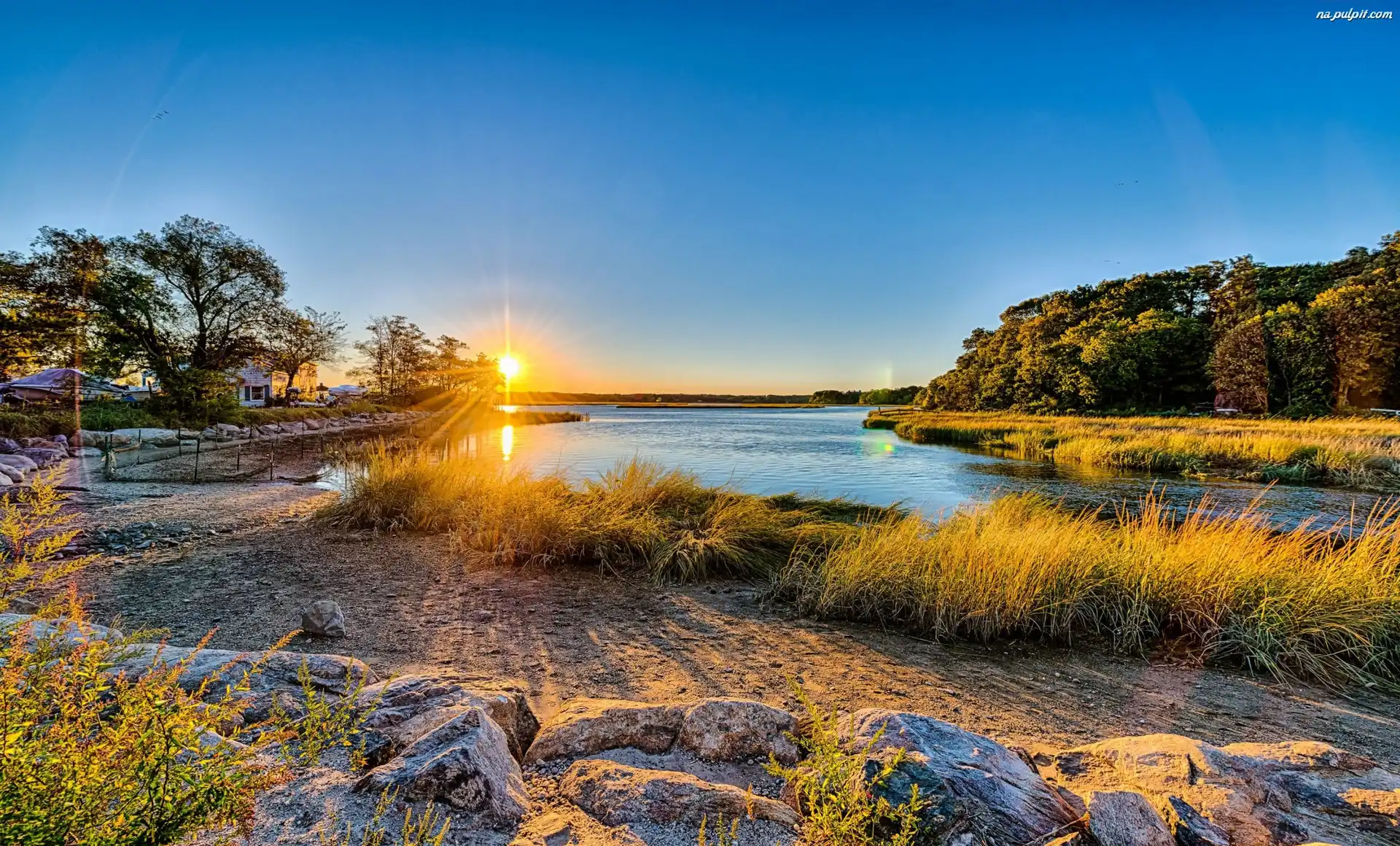 Drzewa, Budynki, Kamienie, Jezioro, Zachód słońca Na Pulpit