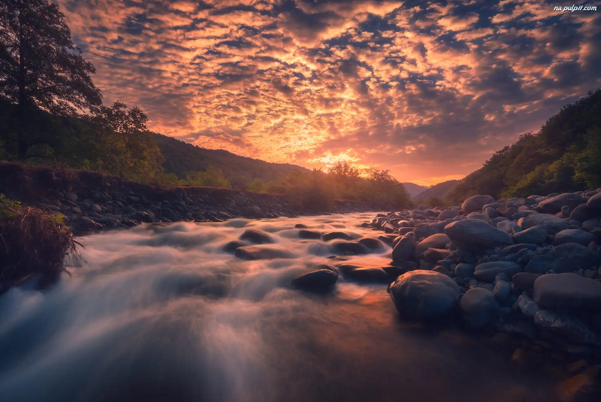 Region Racza-Leczchumi, Kamienie, Zachód słońca, Gruzja, Rzeka Rioni, Drzewa Na Pulpit