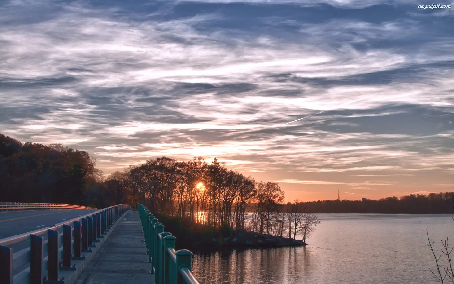 Drzewa, Jezioro, Most, Zachód Słońca Na Pulpit