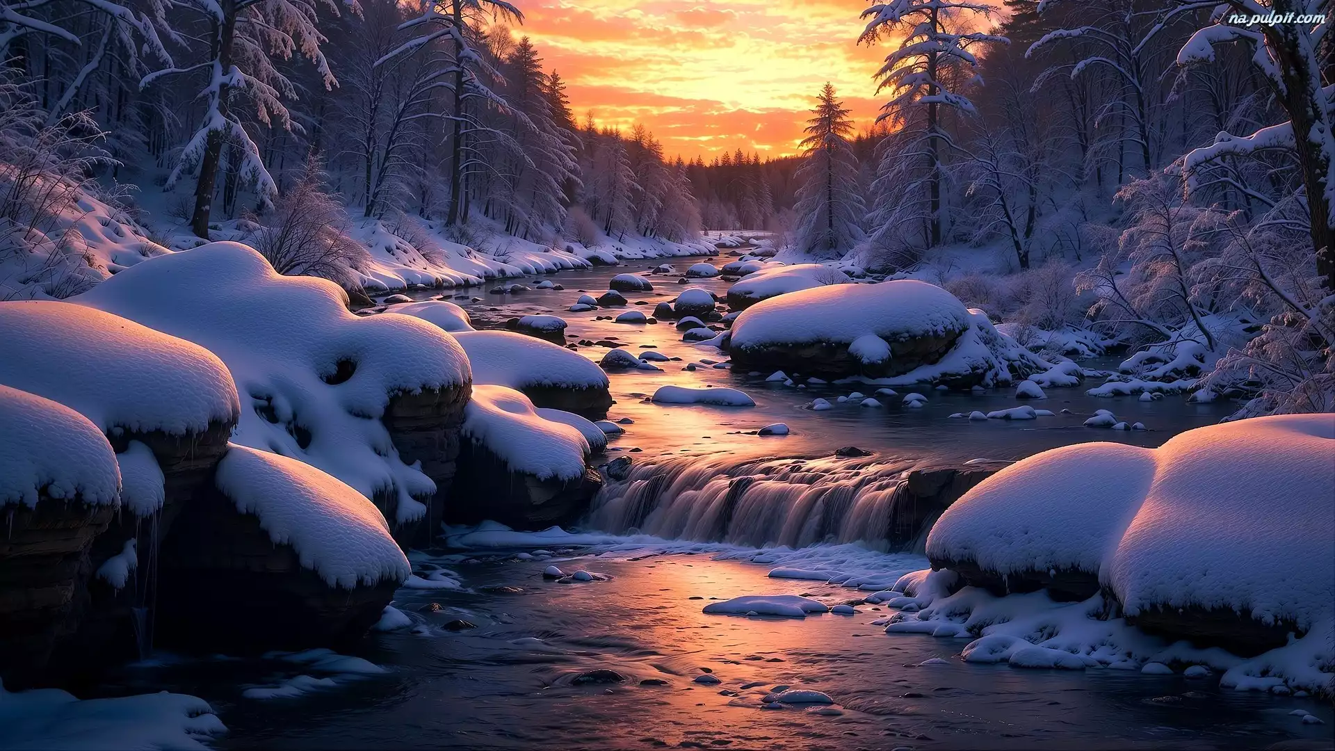 Śnieg, Ośnieżone, Zachód słońca, Zima, Rzeka, Uskok, Drzewa Na Pulpit