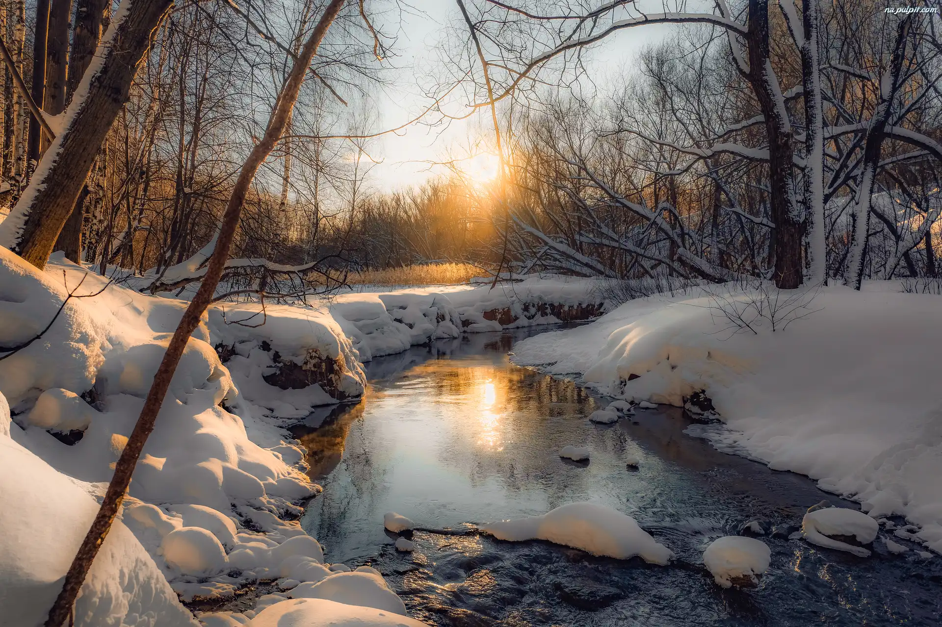 Drzewa, Zima, Rzeka, Zachód słońca Na Pulpit