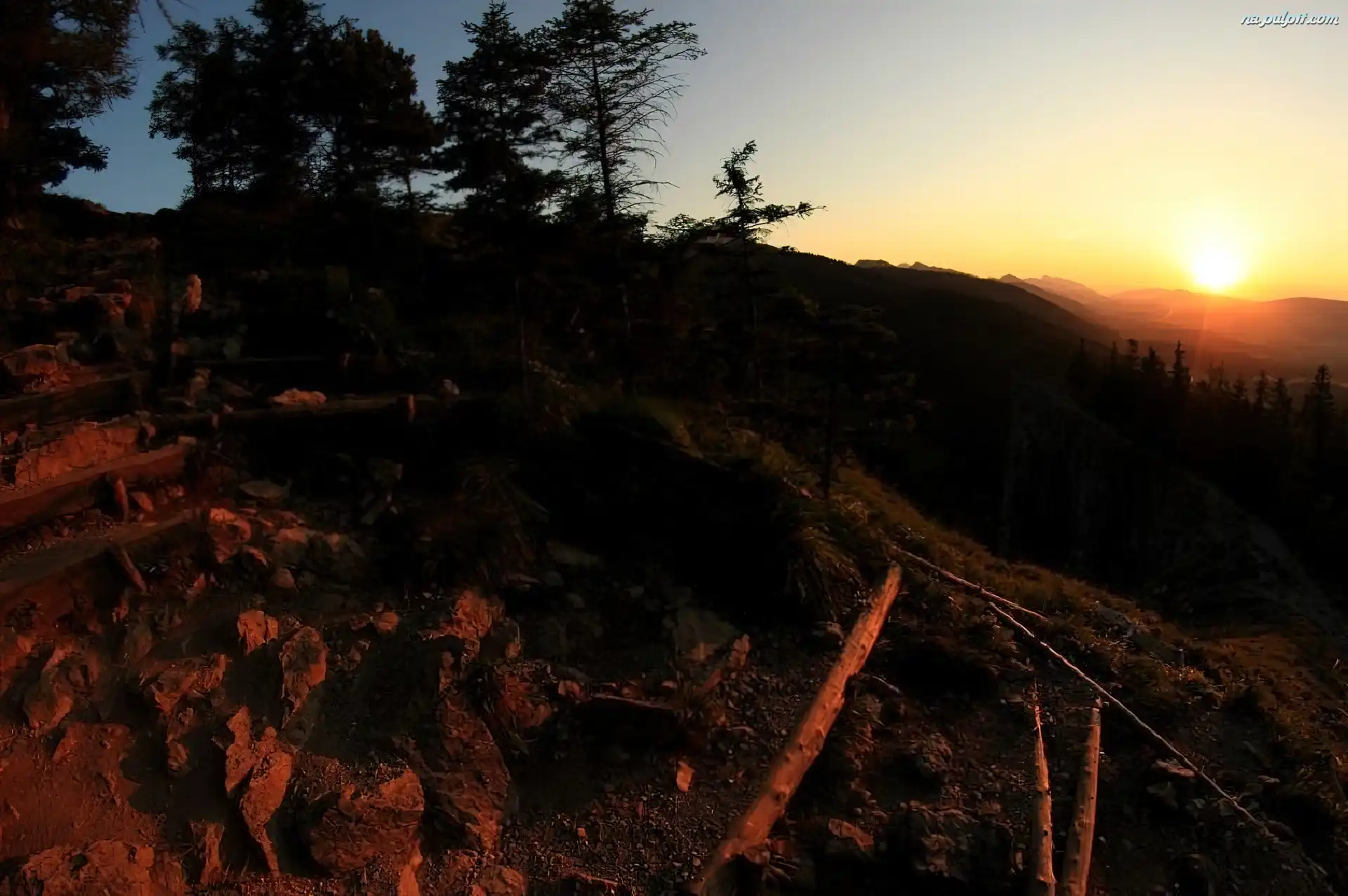 Drzewa, Słońca, Zachód, Góry