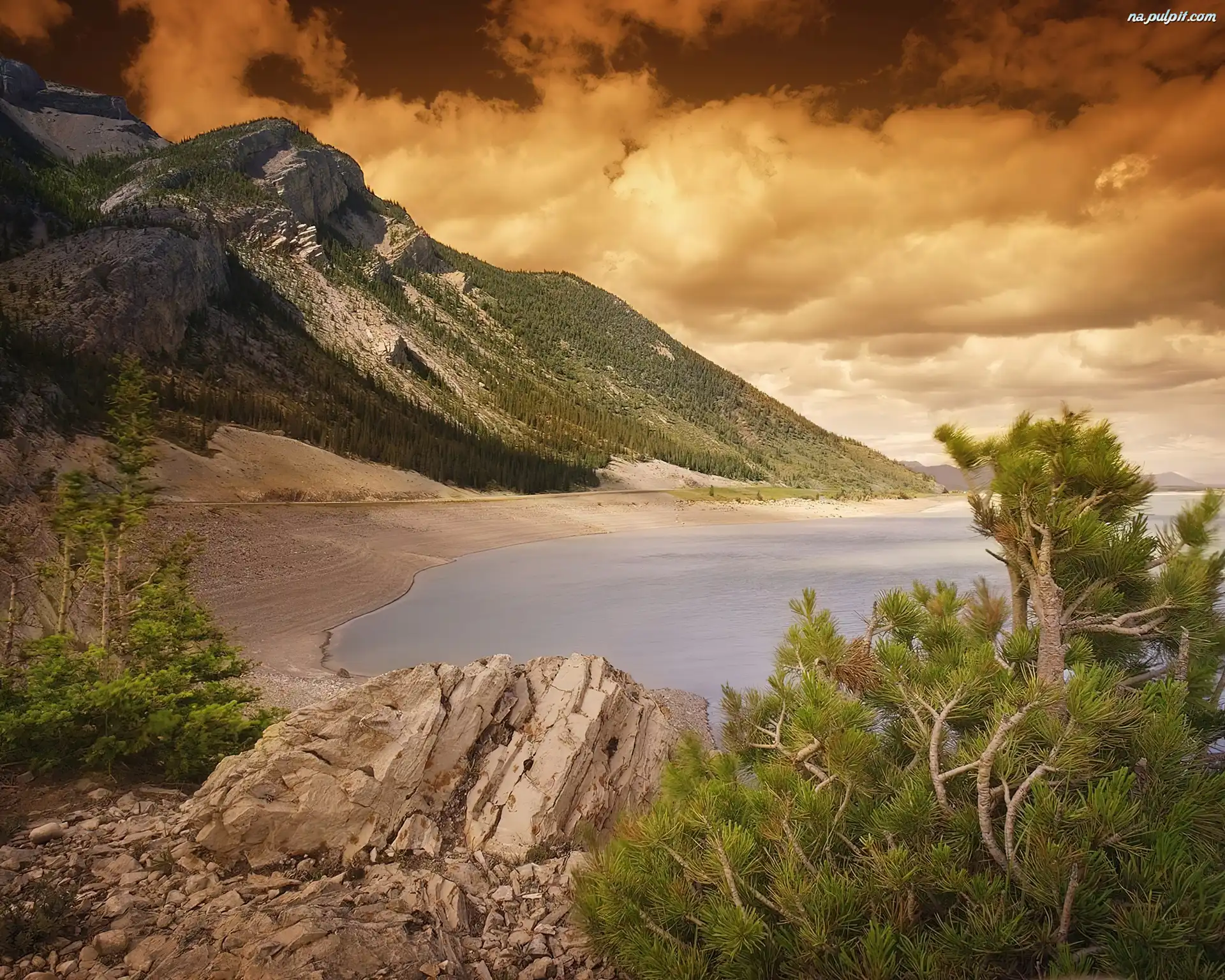 Drzewa, Jezioro, Słońca, Zachód, Góry Na Pulpit