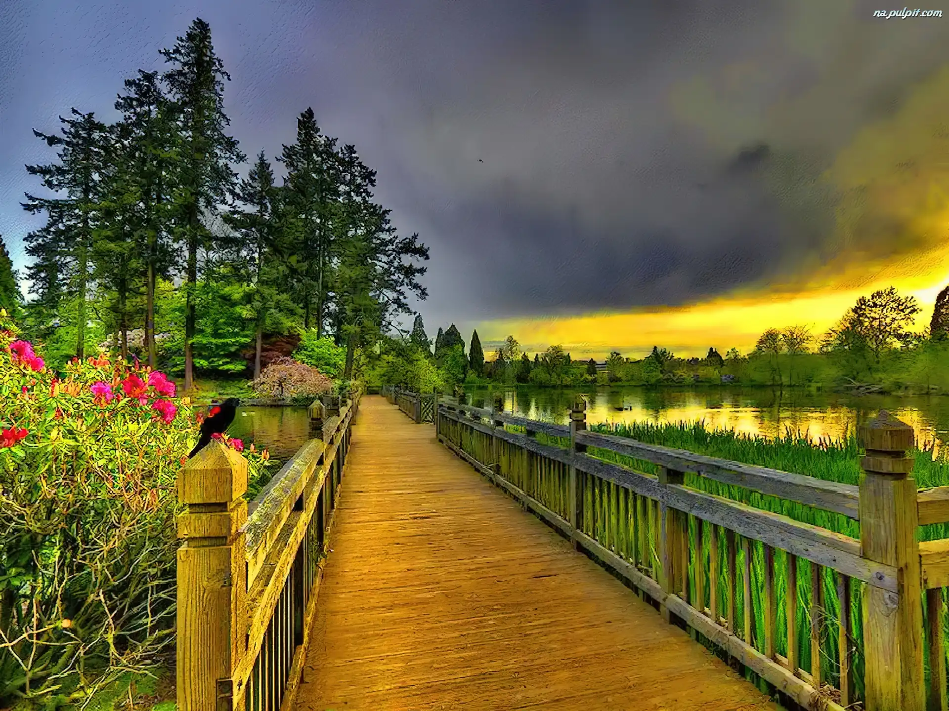 Drzewa, Jezioro, Słońca, Zachód, Mostek