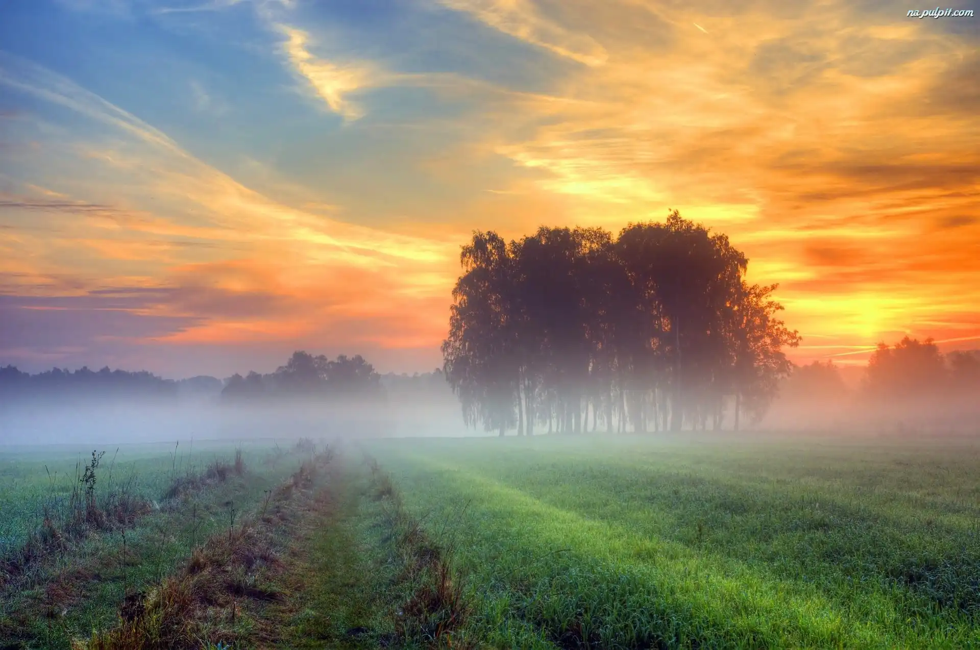 Drzewa, Słońca, Zachód, Mgła Na Pulpit