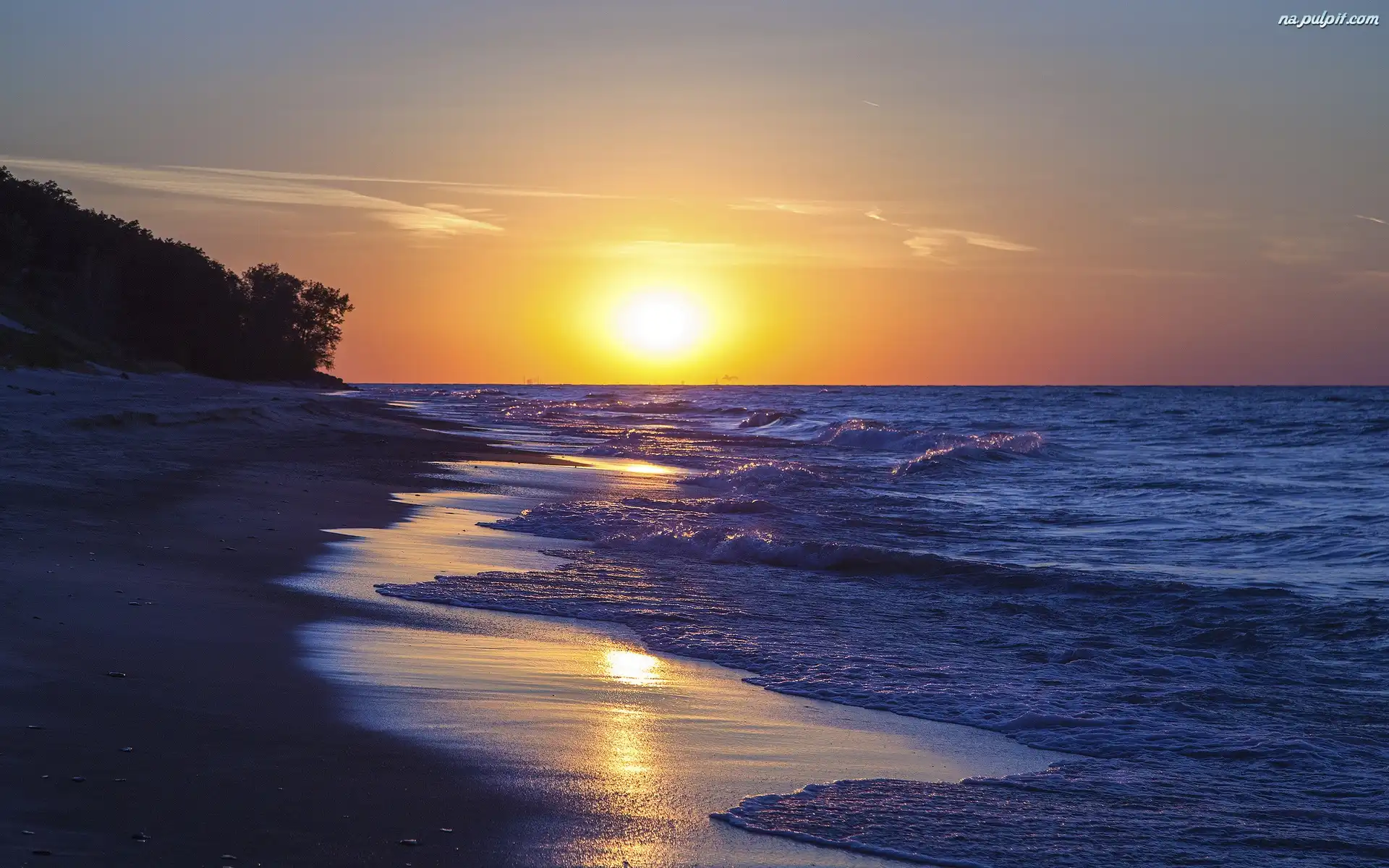 Drzewa, Słońca, Zachód, Morze