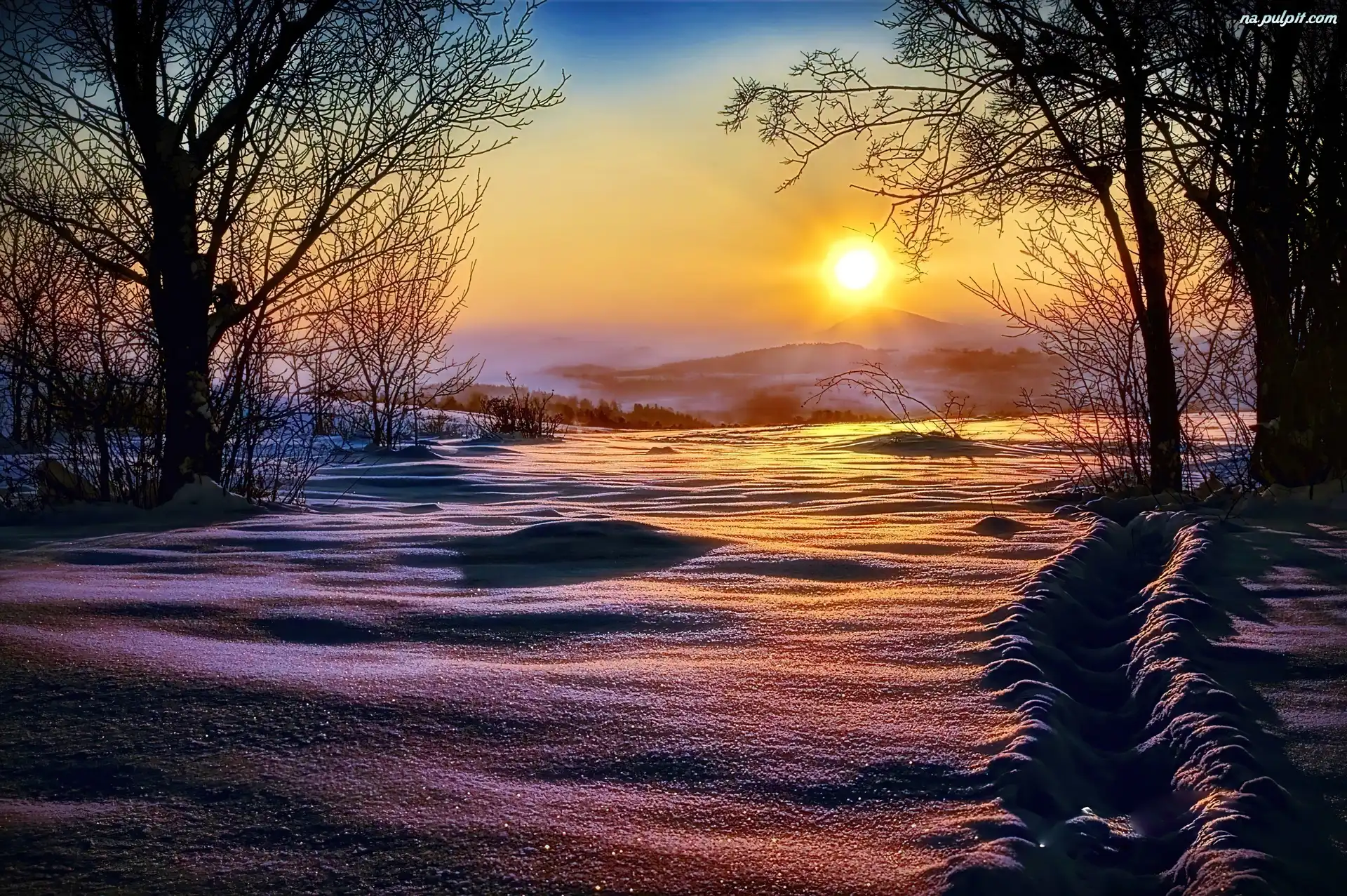 Drzewa, Słońca, Zachód, Snieg Na Pulpit