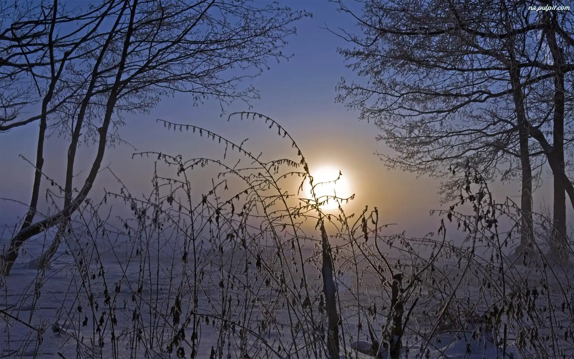 Drzewa, Słońca, Zachód, Zima Na Pulpit