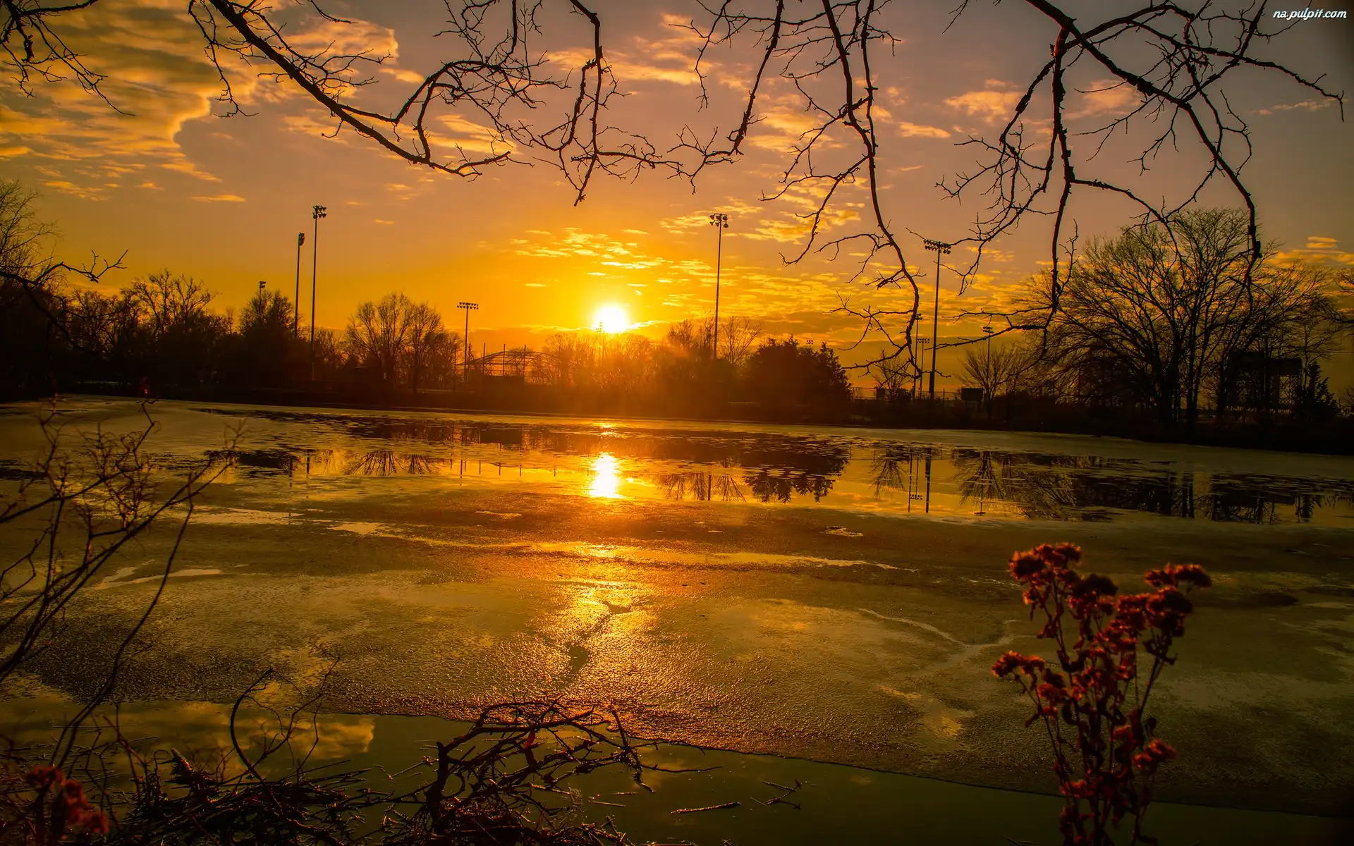 Drzewa, Staw, Zachód słońca Na Pulpit