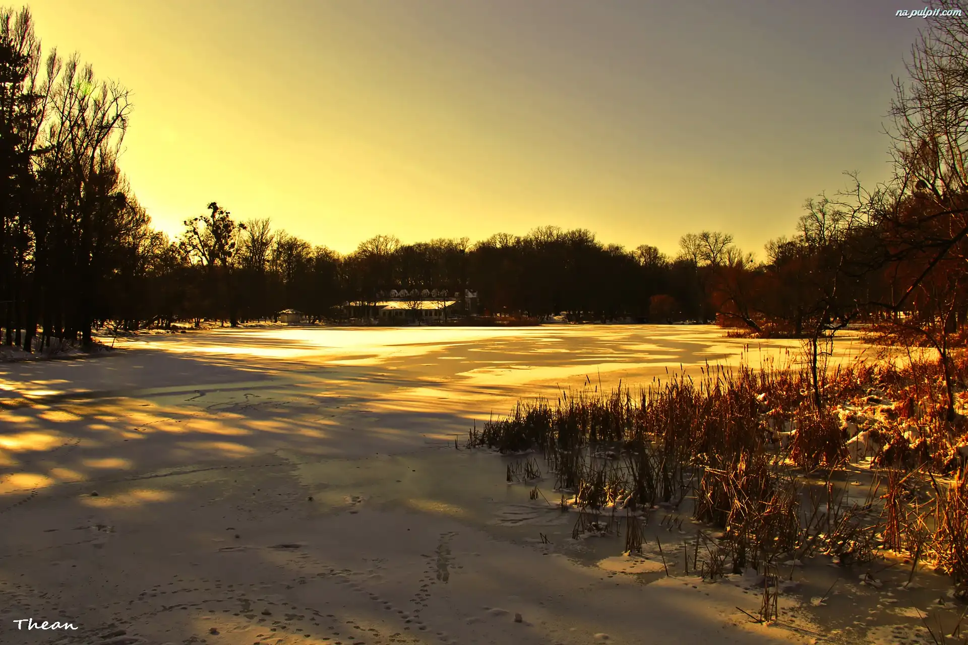Drzewa, Jezioro, Zamarznięte, Zima Na Pulpit