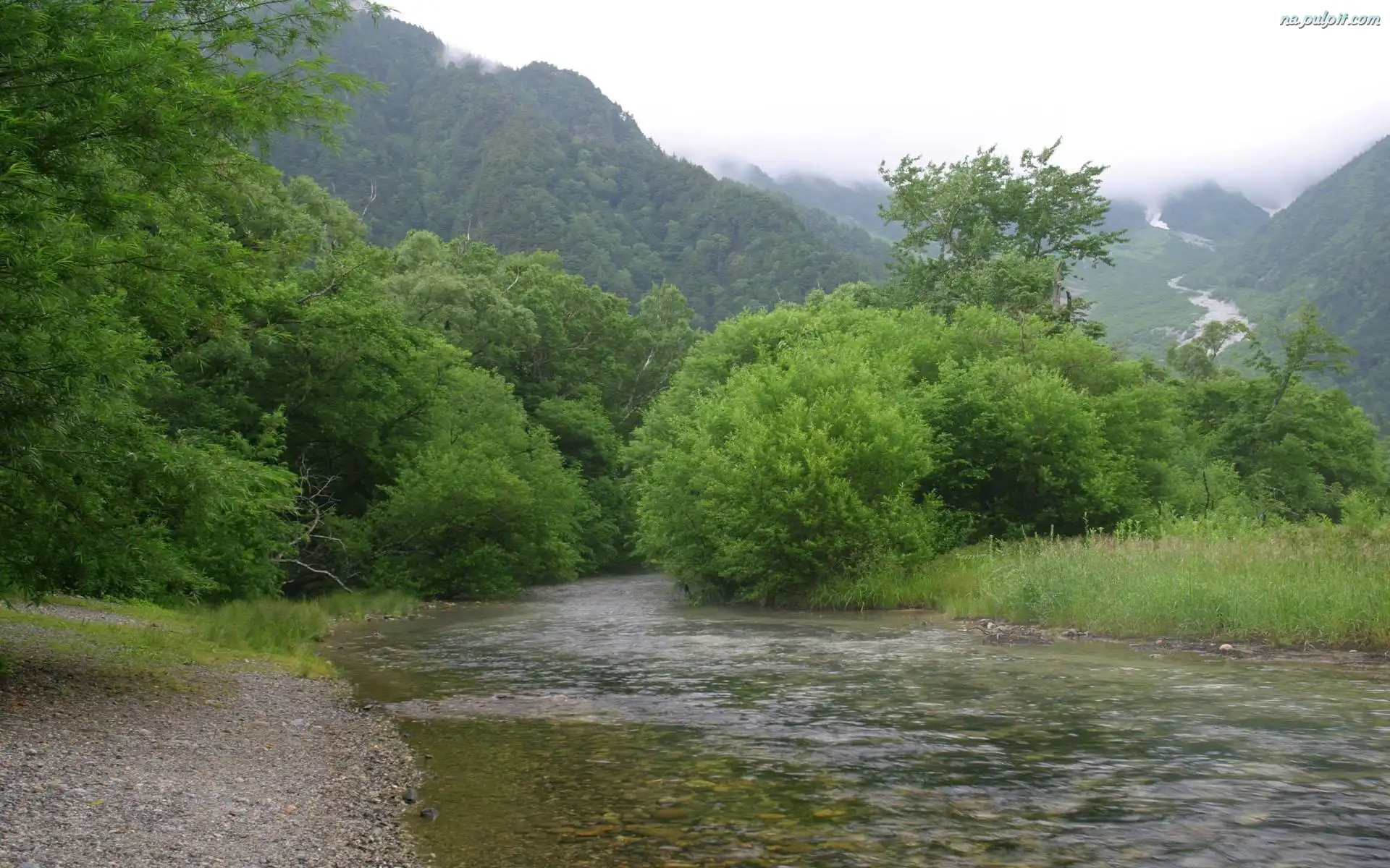 Drzewa, Gór, Rzeka, Krzewy, Zielone, Szczyty